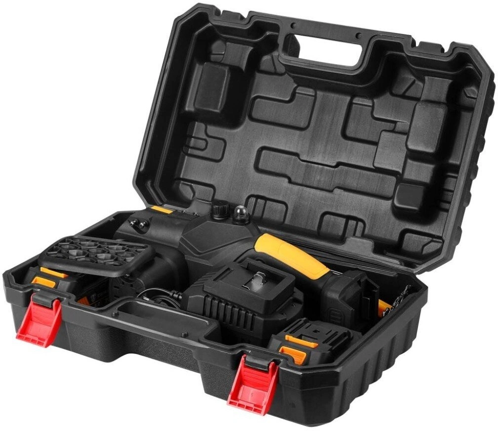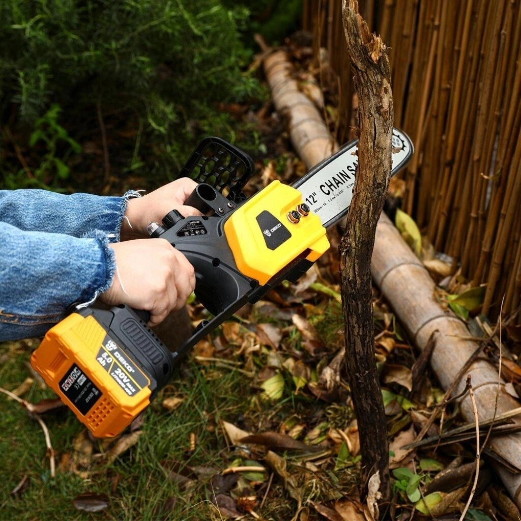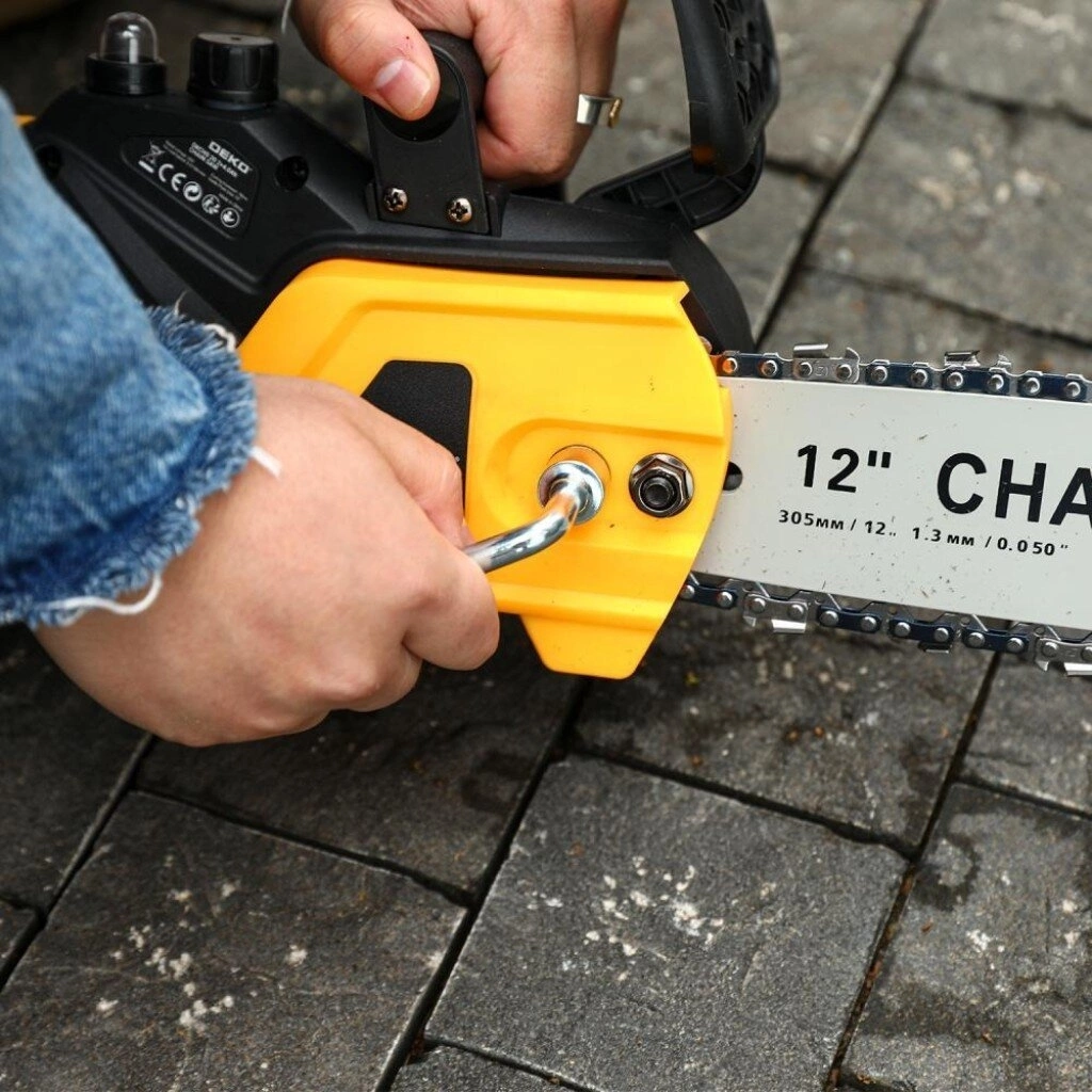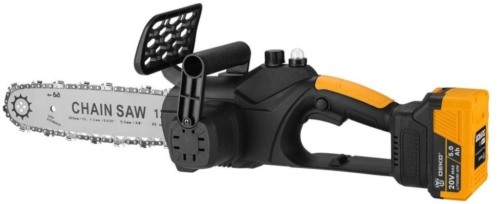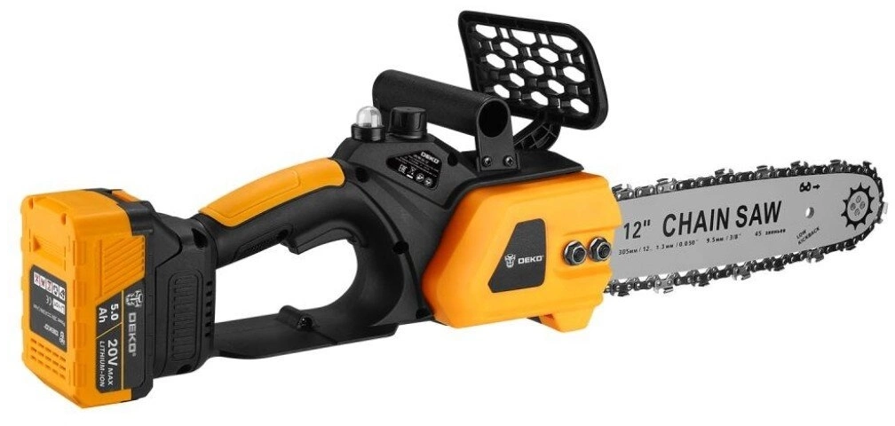 Пила цепная аккумуляторная бесщеточная в кейсе DEKO DKCHS 20, 12", 20В, 2x5.0Ач, з/у применяется при работе в мастерской или в саду для распиливания различных материалов. Предназначена для пропилов в древесине и пластмассе. Инструмент работает от литий-ионного аккумулятора.