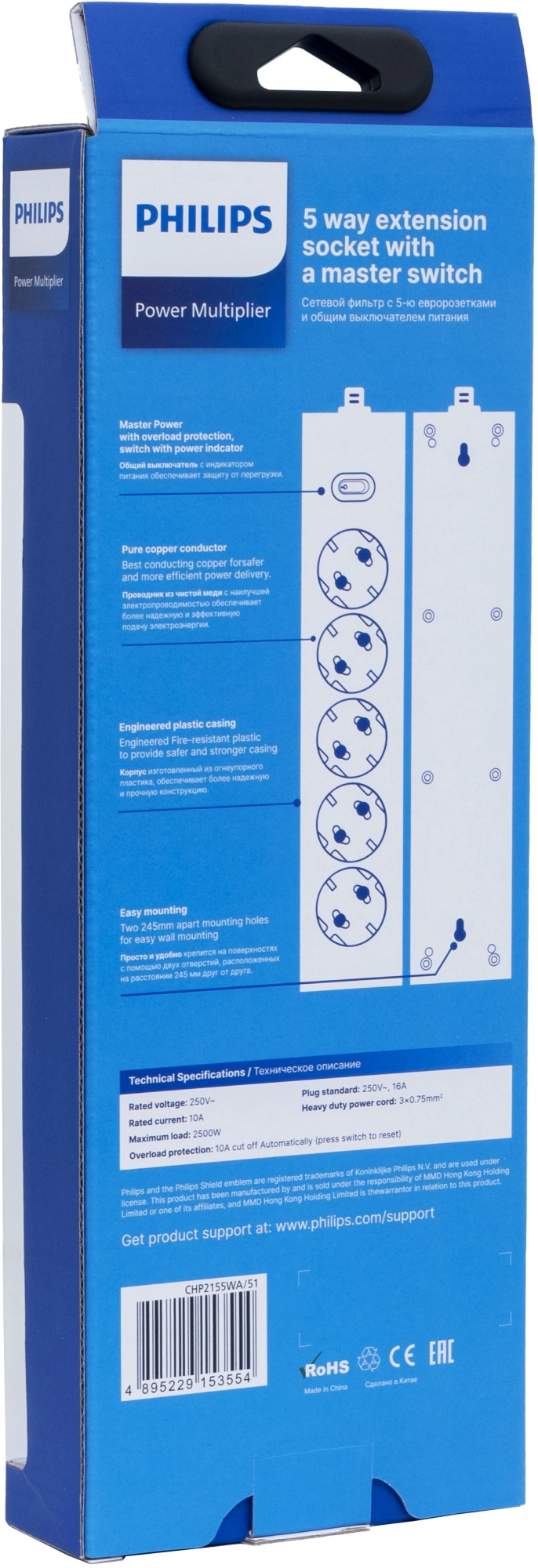 Сетевой фильтр Philips CHP2155WA/51 2м (5 розеток) белый (коробка)