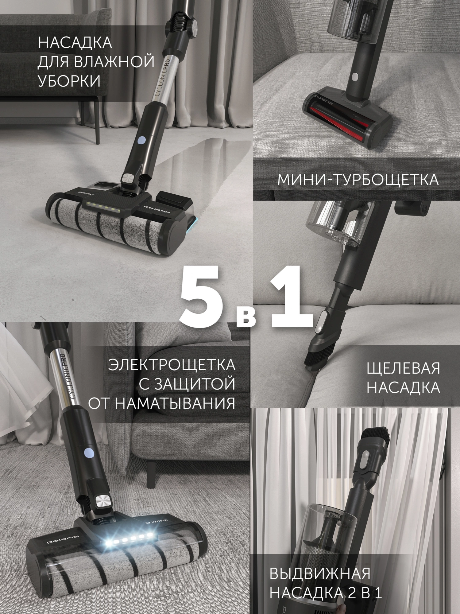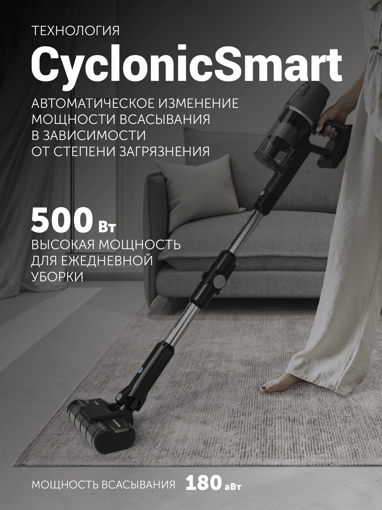 500 Вт Высокая мощность для ежедневной уборки Время работы до 60 минут 10 лет Гарантия на инверторный мотор 5 в 1 БЕСПРОВОДНОЙ Вертикальный и компактный ручной МОЮЩИЙ 4 НАСАДКИ