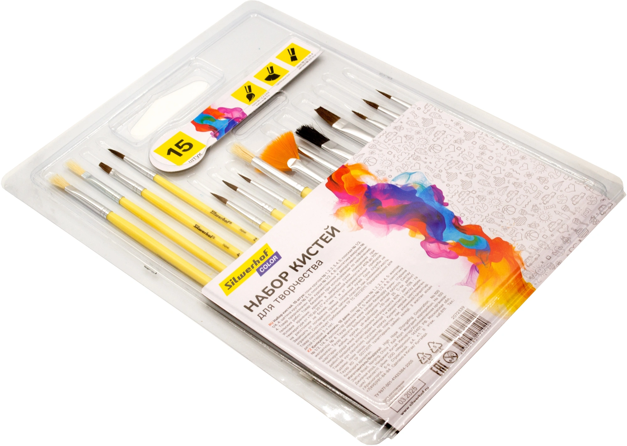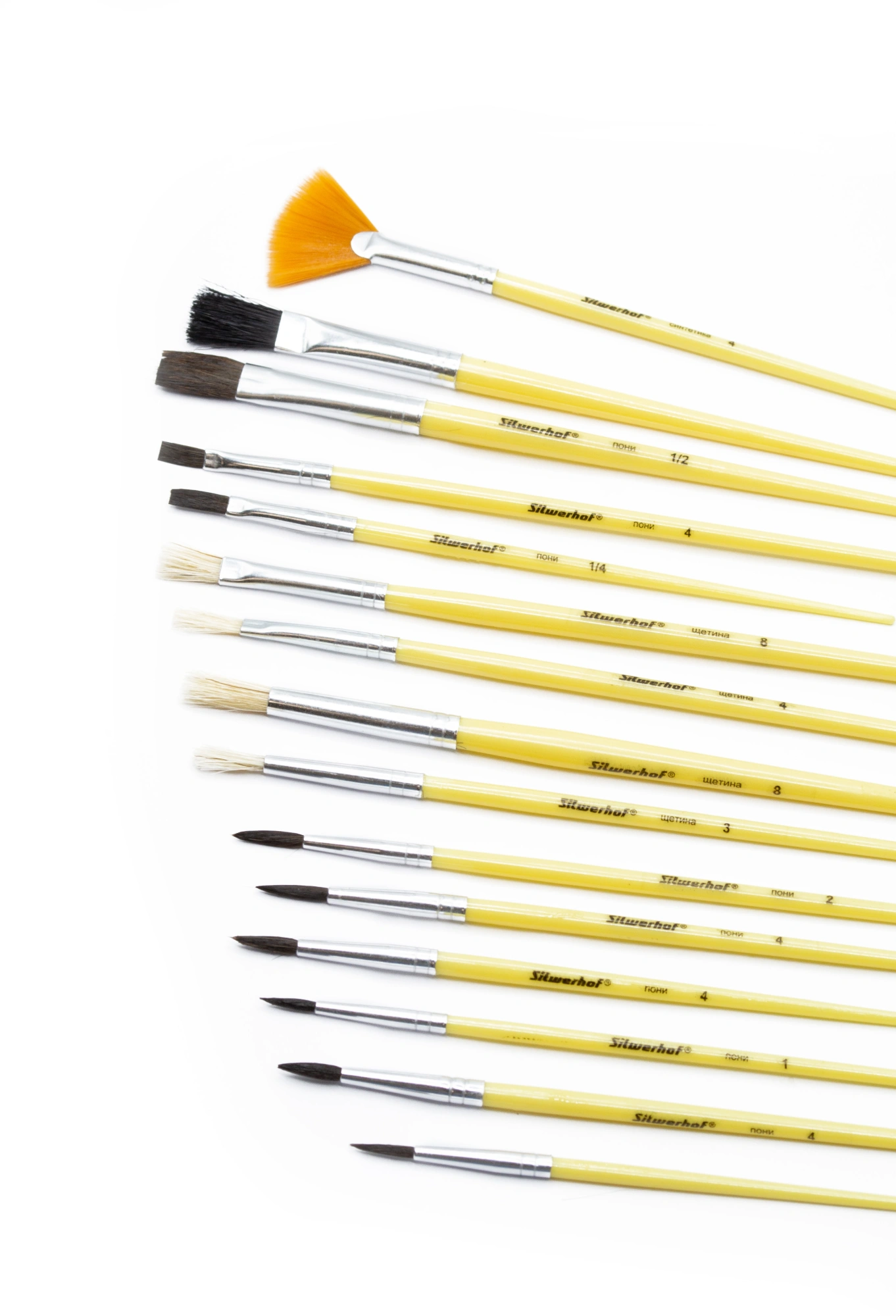 Набор кистей Silwerhof Color (наб.15шт) пон.кр.№1,2,3,4,5/плос.№1/2, 1/4, 4/кр.№3,5/плоск.№1/2, 4, 8/синт.веер.№4