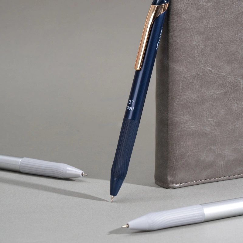 Ручка шариков. автоматическая Deli EQ88-BL d=0.7мм син. черн. карт.уп. игловидный пиш. наконечник резин. манжета чернила пониженной вязкости