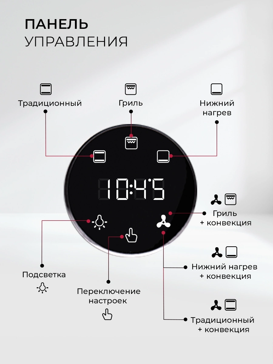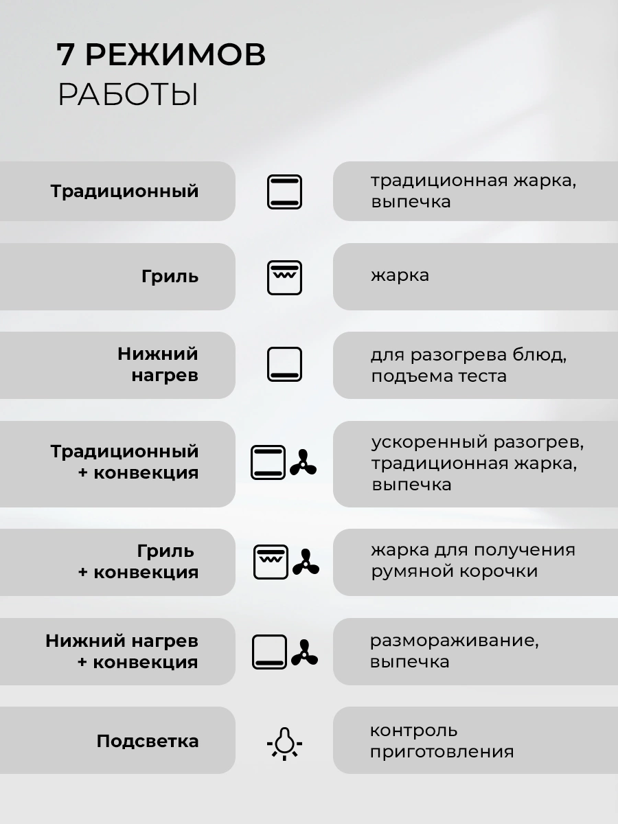 - Режимы духовкиГриль, Гриль с конвекцией, Нижний нагрев, Нижний нагрев с конвекцией, Подсветка, Традиционный, Традиционныи? нагрев + конвекция
