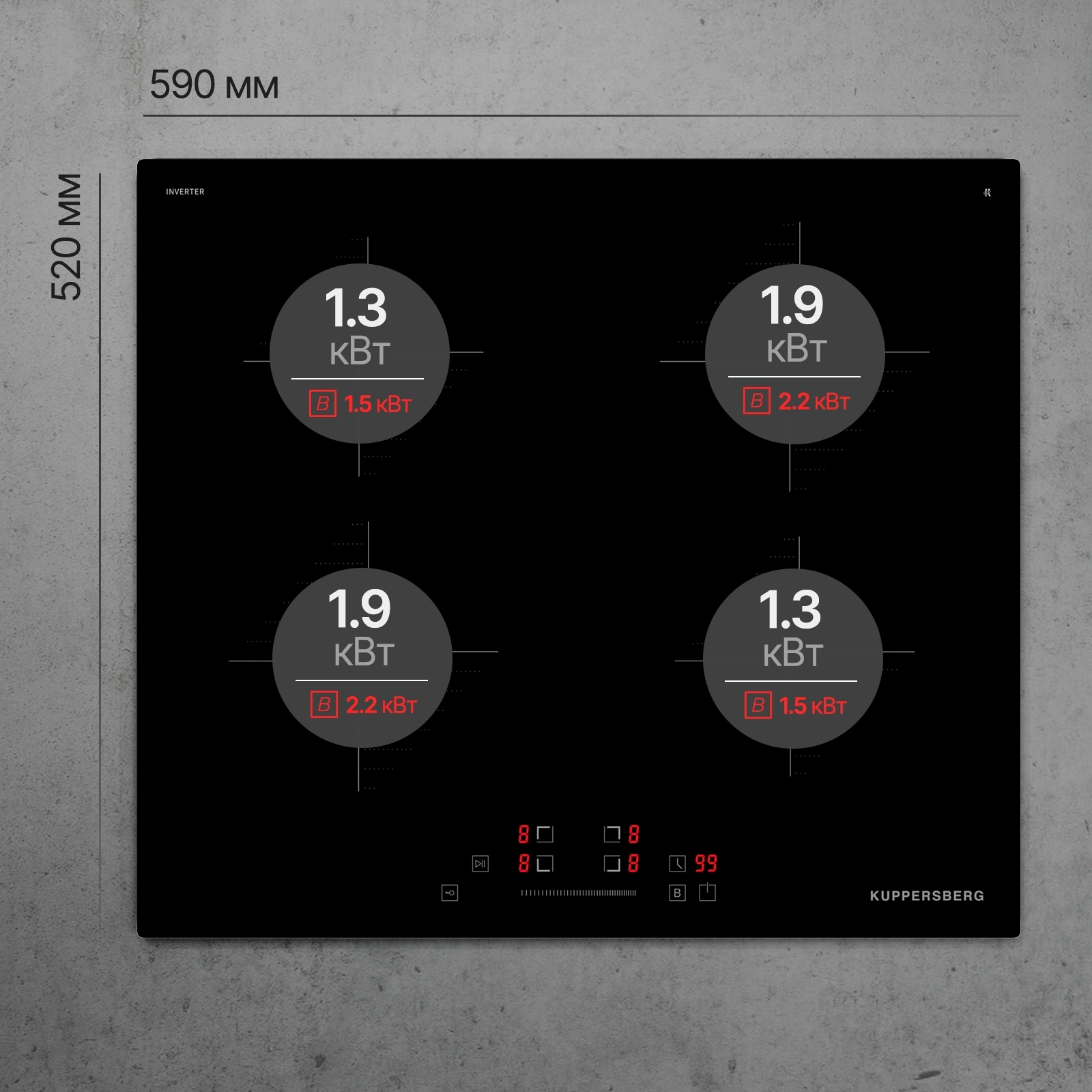 - Мощность (правой дальней конфорки)1.9/2.2 кВт