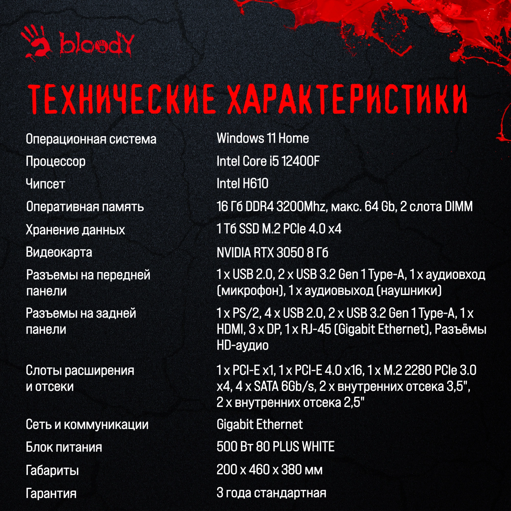 ПК Bloody BD-PC CH61C1 MT i5 12400F (2.5) 16Gb SSD1Tb RTX3050 8Gb Windows 11 Home 64 GbitEth 500W черный (2085725)