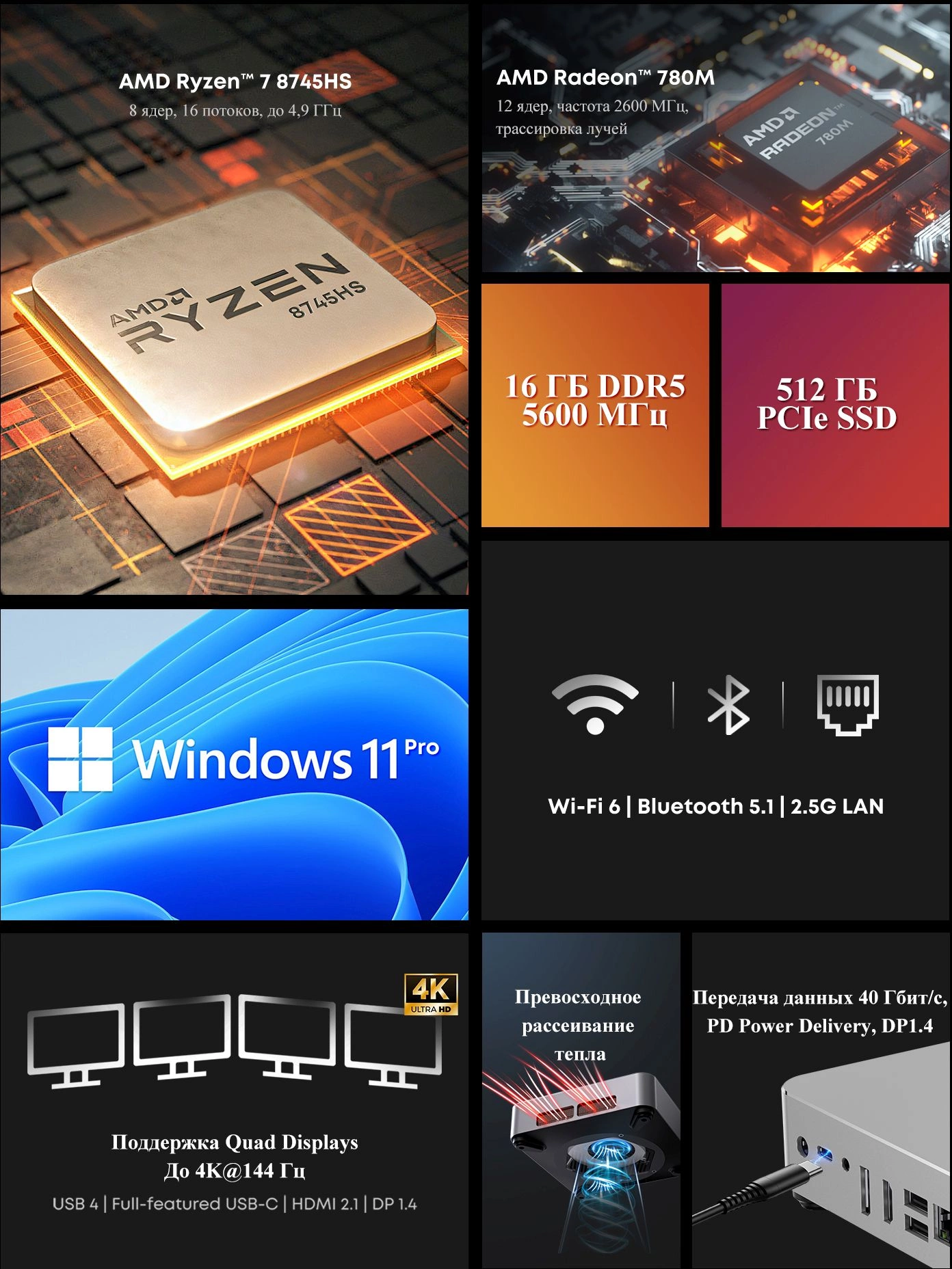 - ПроцессорAMD Ryzen 7 8745HS 3.8ГГц