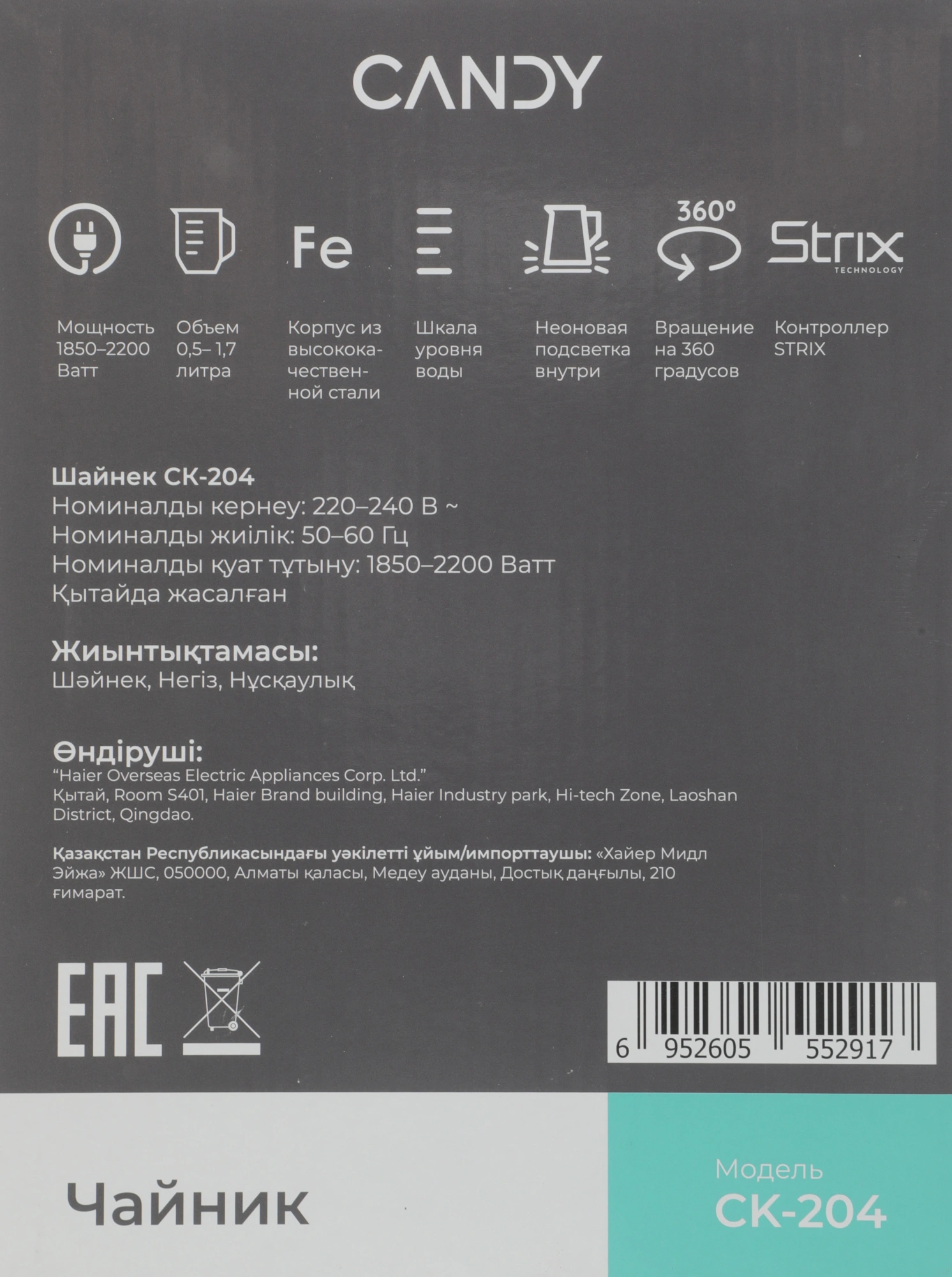 Чайник электрический Candy CK-204 1.7л. 2200Вт графит корпус: нерж.сталь