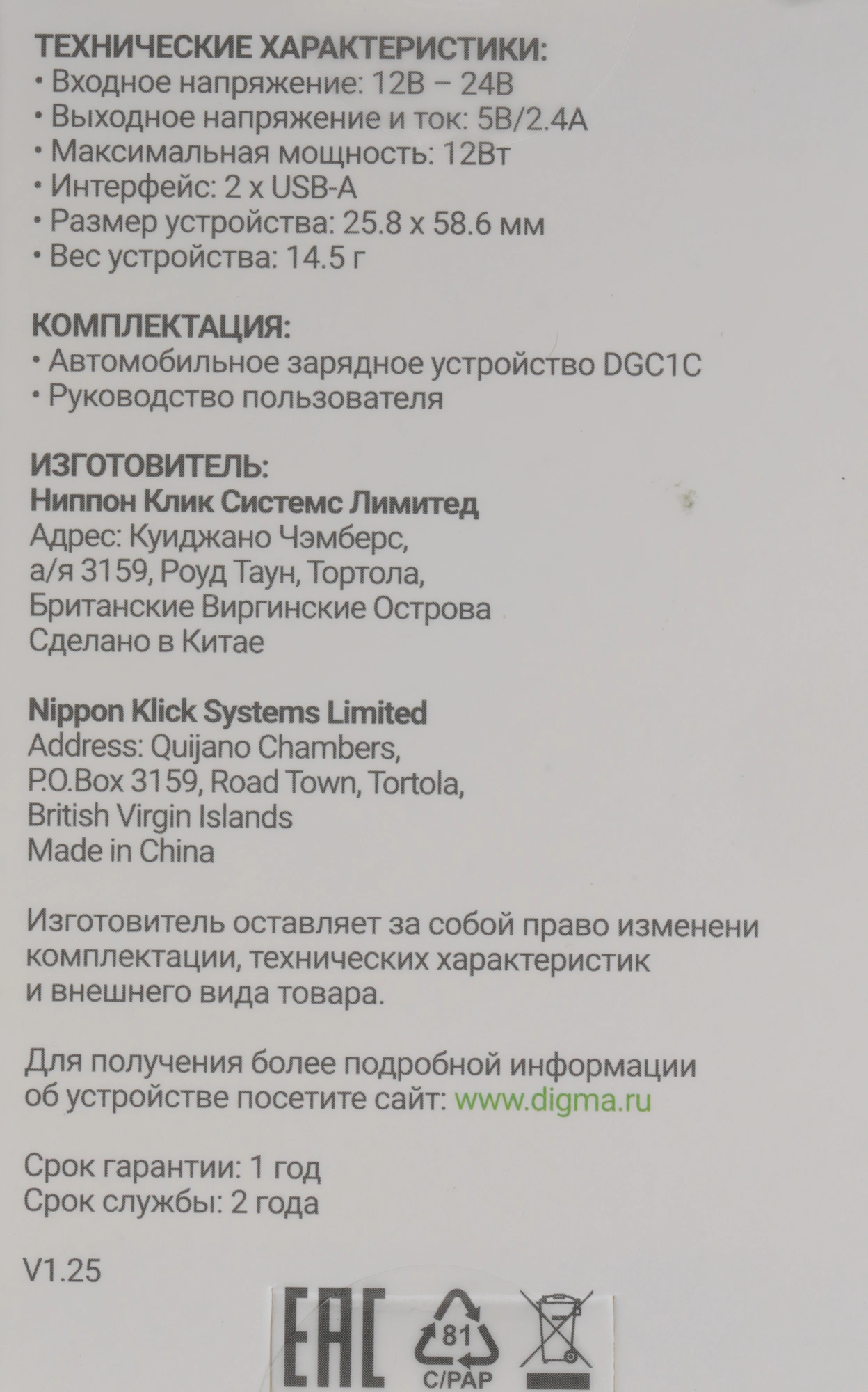 Автомобильное зар./устр. Digma DGC1С 12W 2.4A 2xUSB белый (DGC1C2LX22WH)