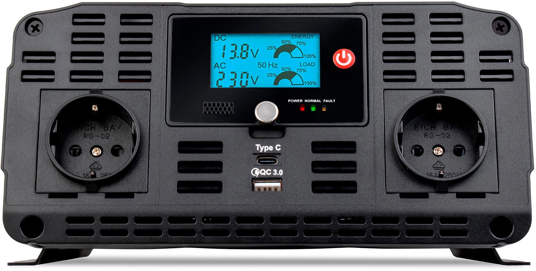 - ОсобенностиЧистая синусоида (PSW), порты Type-C и USB с QC, корпус ABS, LCD-экран, активное охлаждение, отслеживание ёмкости аккумулятора, медные контакты с огнестойкой оболочкой, крепления для фиксации инвертора, 6 предохранителей 40A, контакт заземления, звуковое предупреждение, система электрических защит