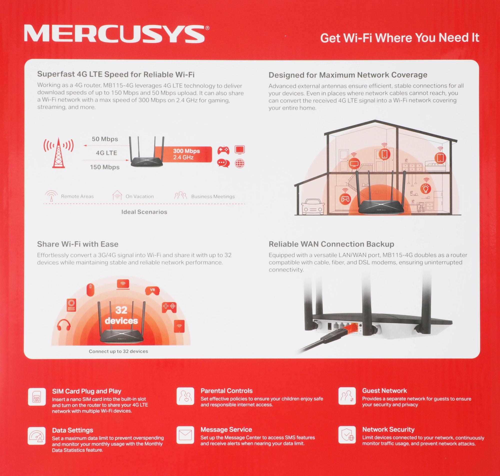 Роутер беспроводной Mercusys MB115-4G N300 10/100BASE-TX/4G cat. 4 черный