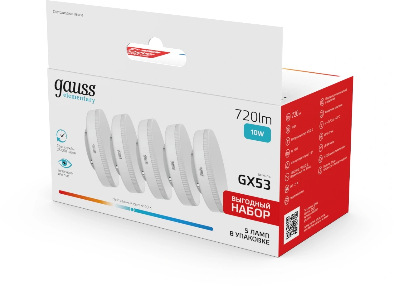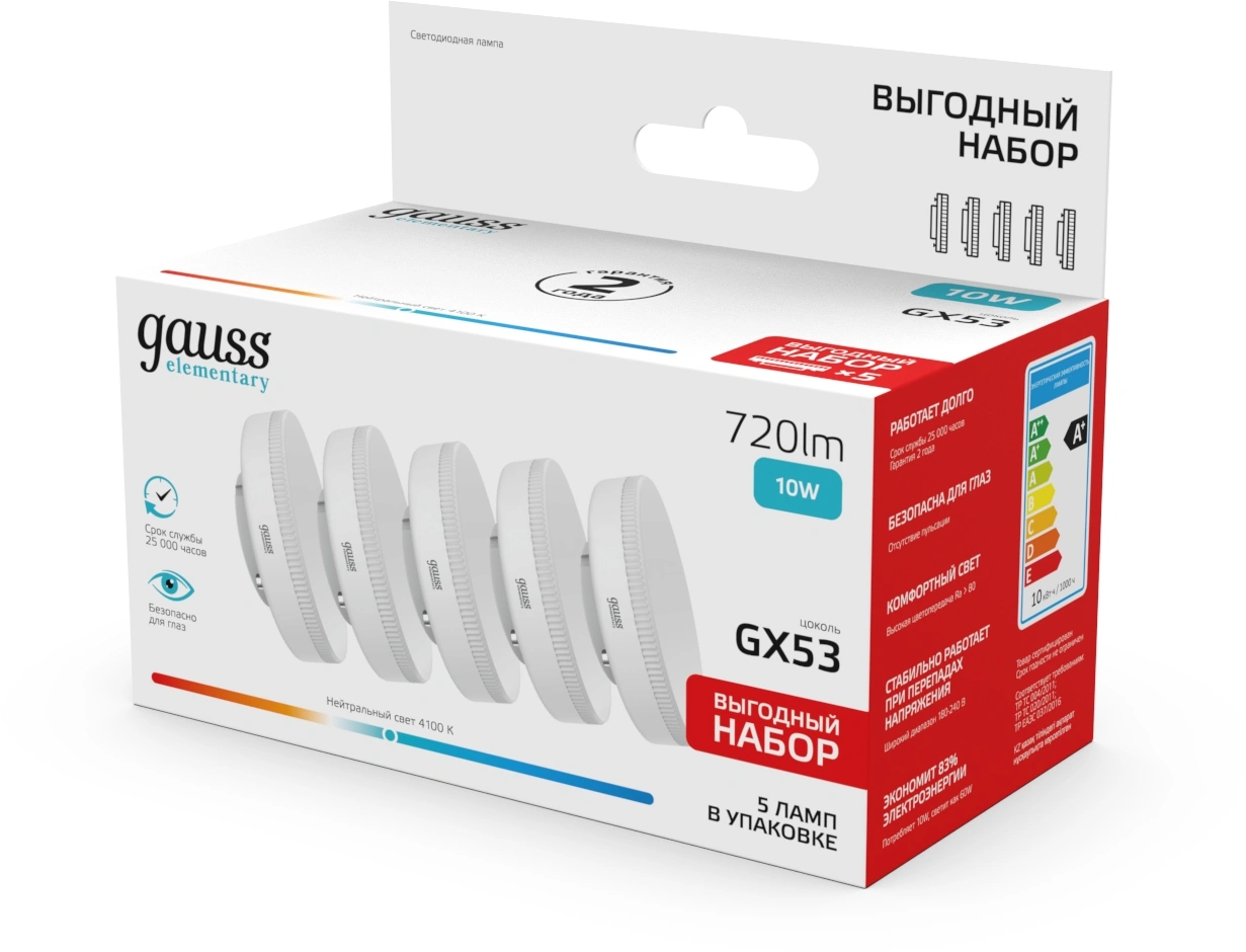 Лампа светодиодная Gauss Elementary 10Вт цок.:GX53 (упак.:5шт) (84820V)