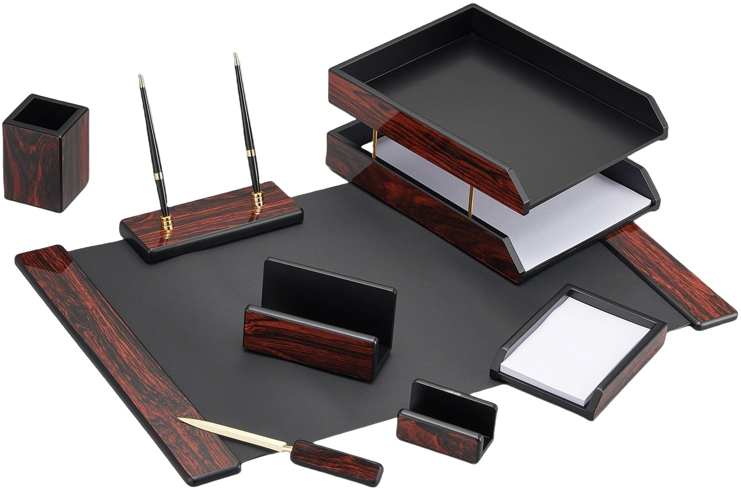 - Состав набораподкладка на стол, подставка для ручек с двумя ручками, лоток для блокнота, визитница,стаканчик для ручек, нож для писем, подставка для писем, лоток для бумаг