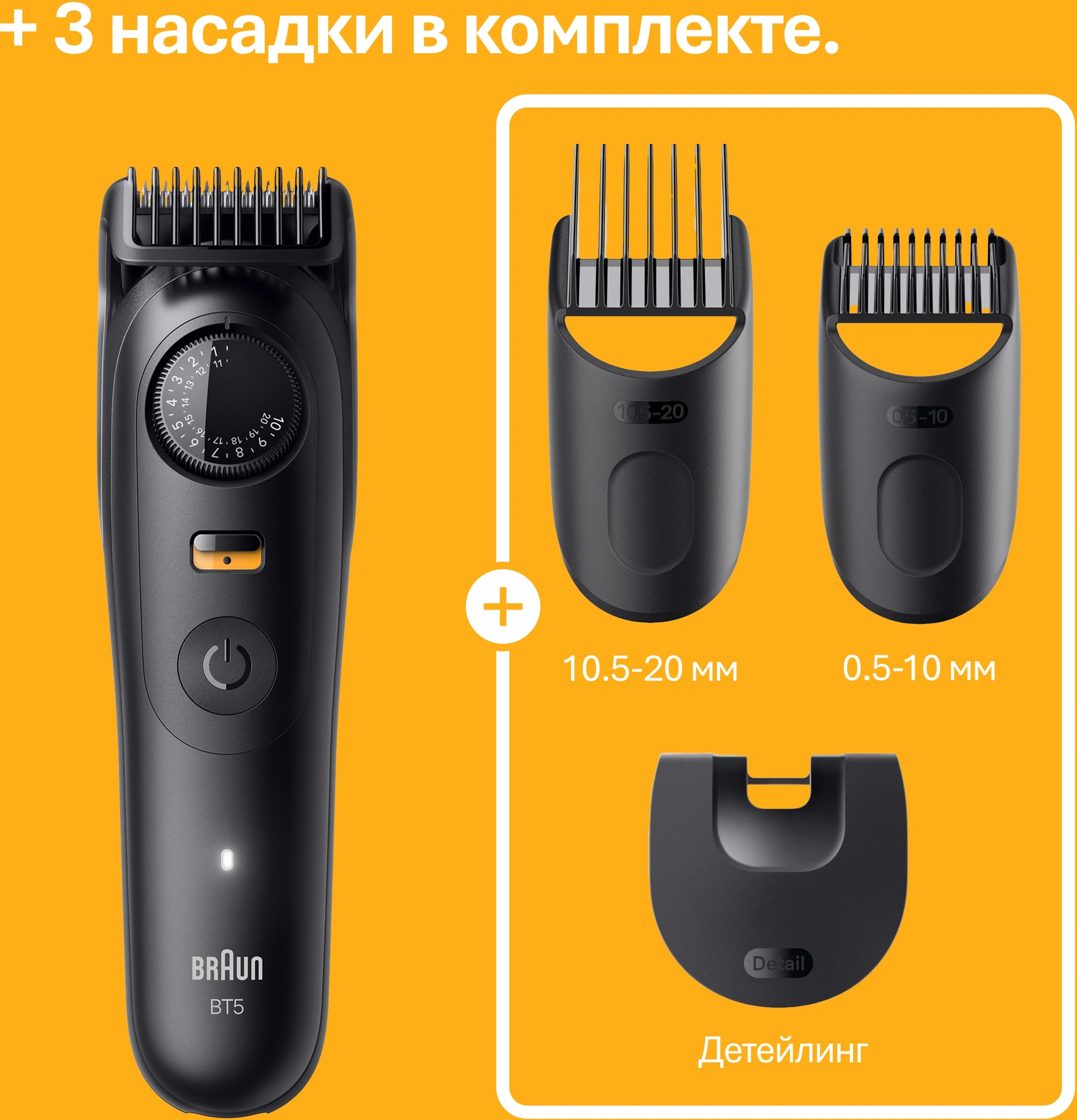 - Насадкигребень для коротких волос (0,5-10 мм); гребень для длинных волос (10,5-20 мм); насадка для точного подравнивания