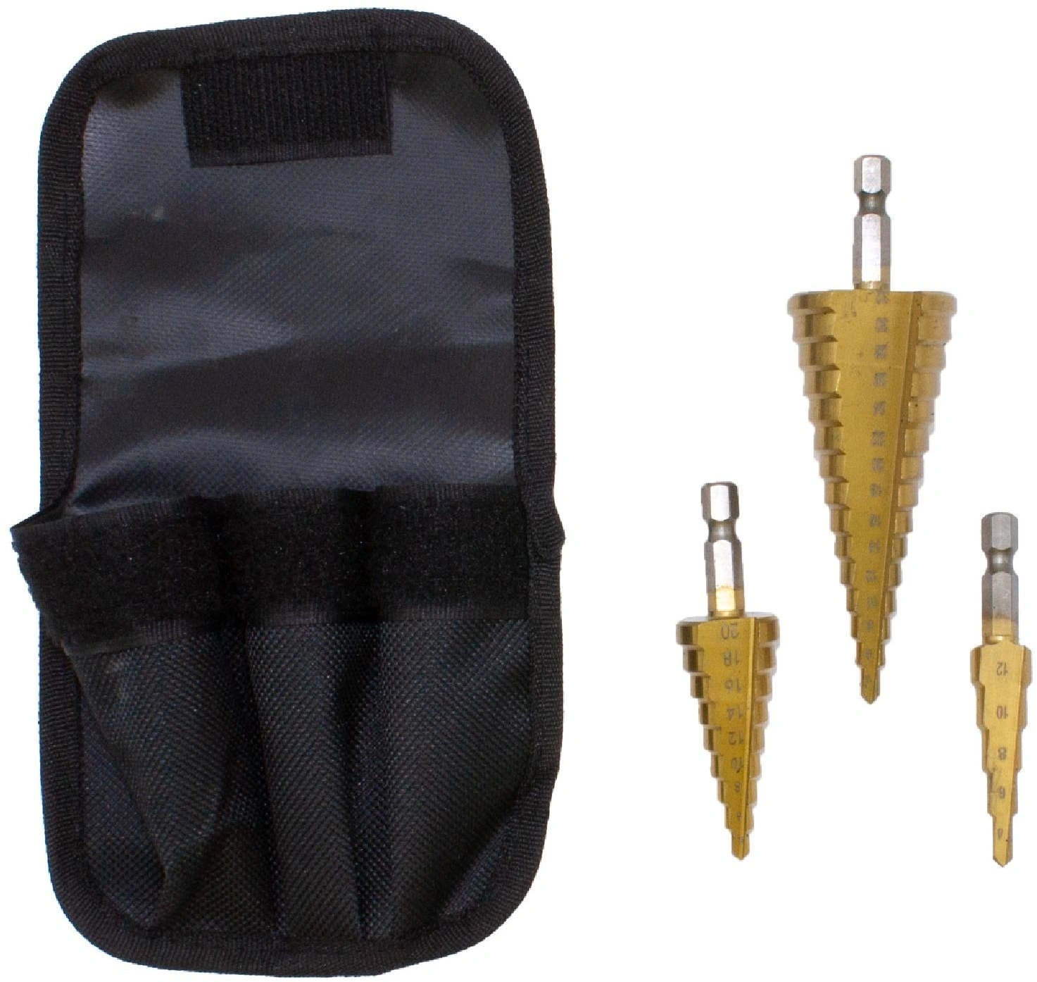 - Состав набораСтупенчатые сверла: малое 16-25 мм., среднее 19-35 мм., а большое 22-45 мм.