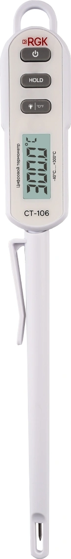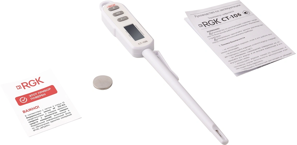 - Комплект поставкиТермометр цифровой RGK CT-106, руководство по эксплуатации, батарея питания.