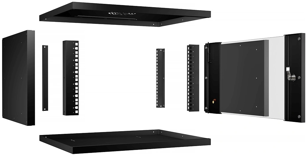 - КомплектацияКаркас шкафа, монтажный профиль 19” - 4 шт., дверь передняя с замком, ключи для замка - 2 шт., комплект крепежа (винт-шайба-гайка).