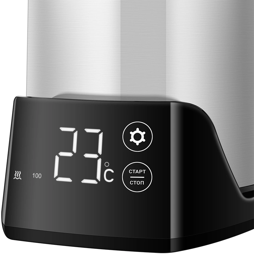 - Конструктивные особенностидвойные стенки, дисплей, звуковой сигнал при закипании, кнопка открытия крышки, отсек для шнура, подставка 360, фильтр от накипи