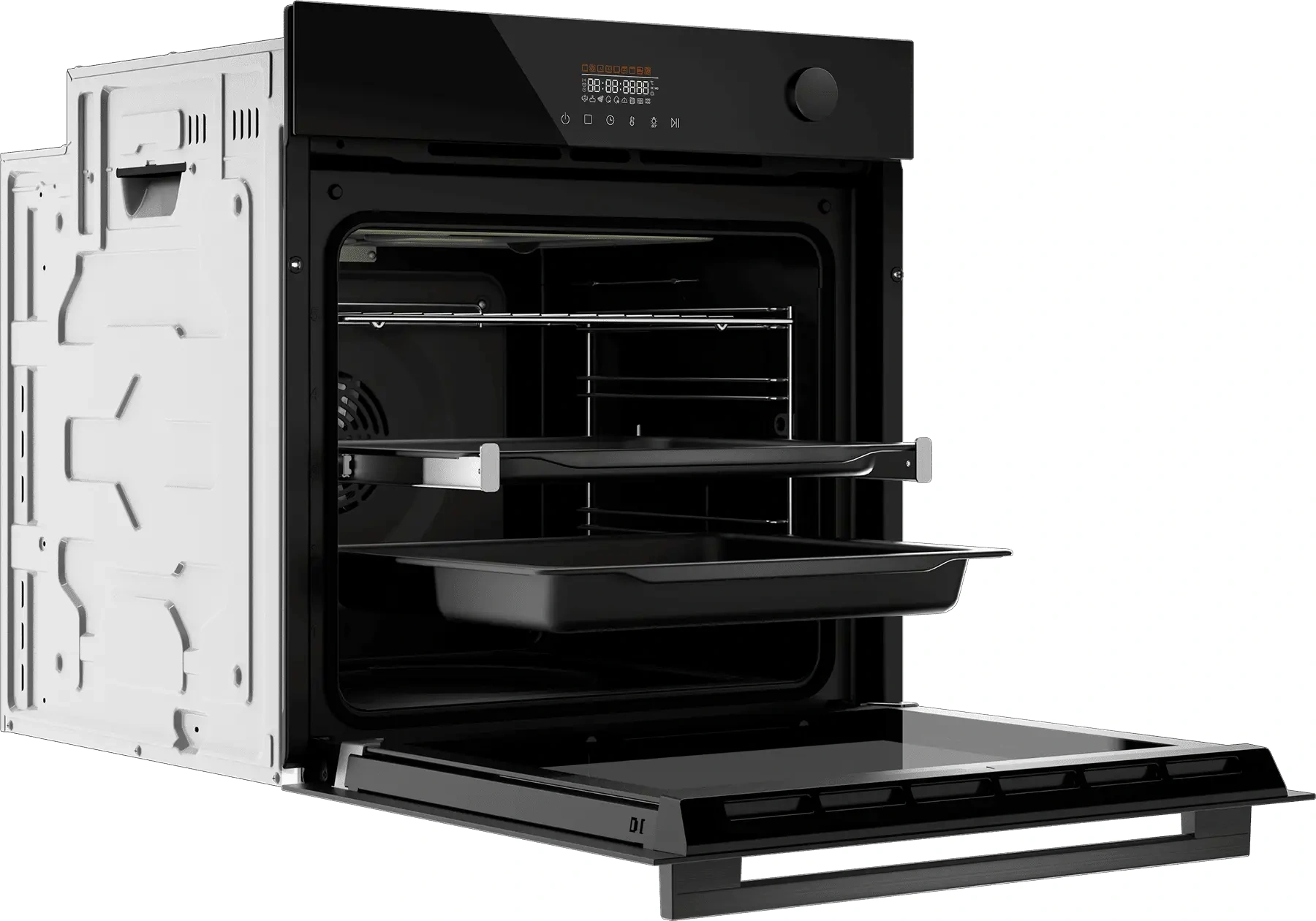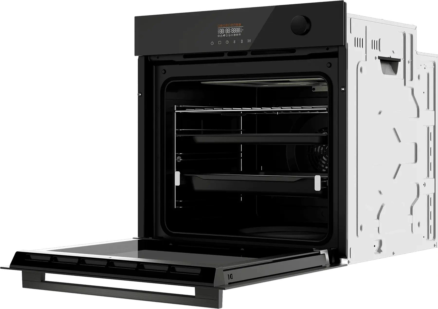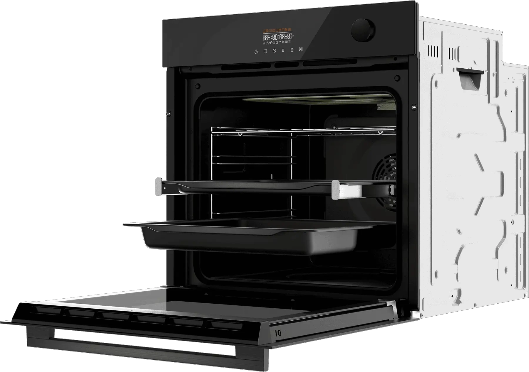 - Особенности конструкциидисплей, полностью стеклянная внутренняя поверхность дверцы духовки, телескопические направляющие