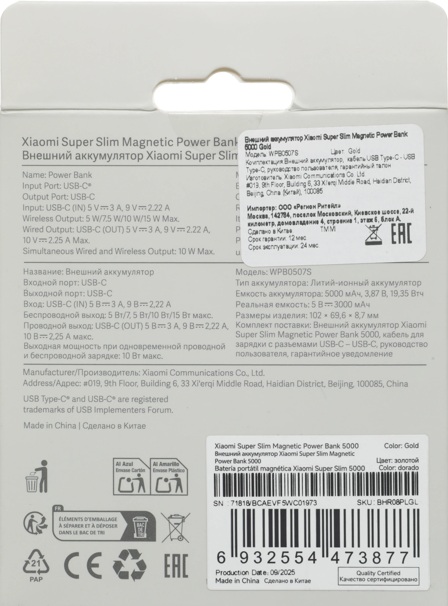 Мобильный аккумулятор Xiaomi Super Slim Magnetic 5000mAh QC3.0/PD3.0 22.5W 3A USB-C беспров.зар. золотистый (BHR08PLGL)