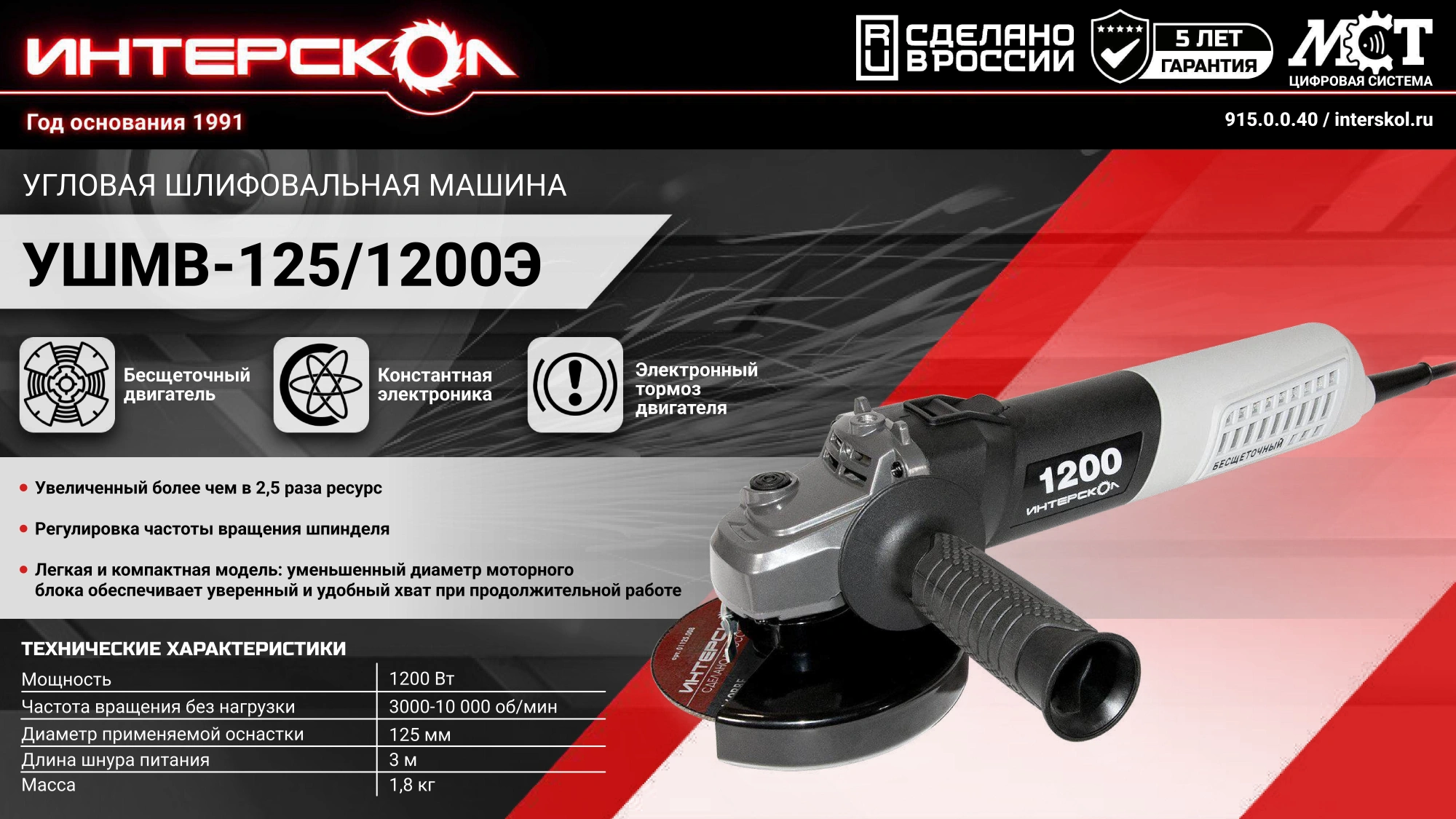 Углошлифовальная машина Интерскол УШМВ-125/1200Э 1200Вт 10000об/мин рез.шпин.:M14 d=150мм (915.0.0.40)