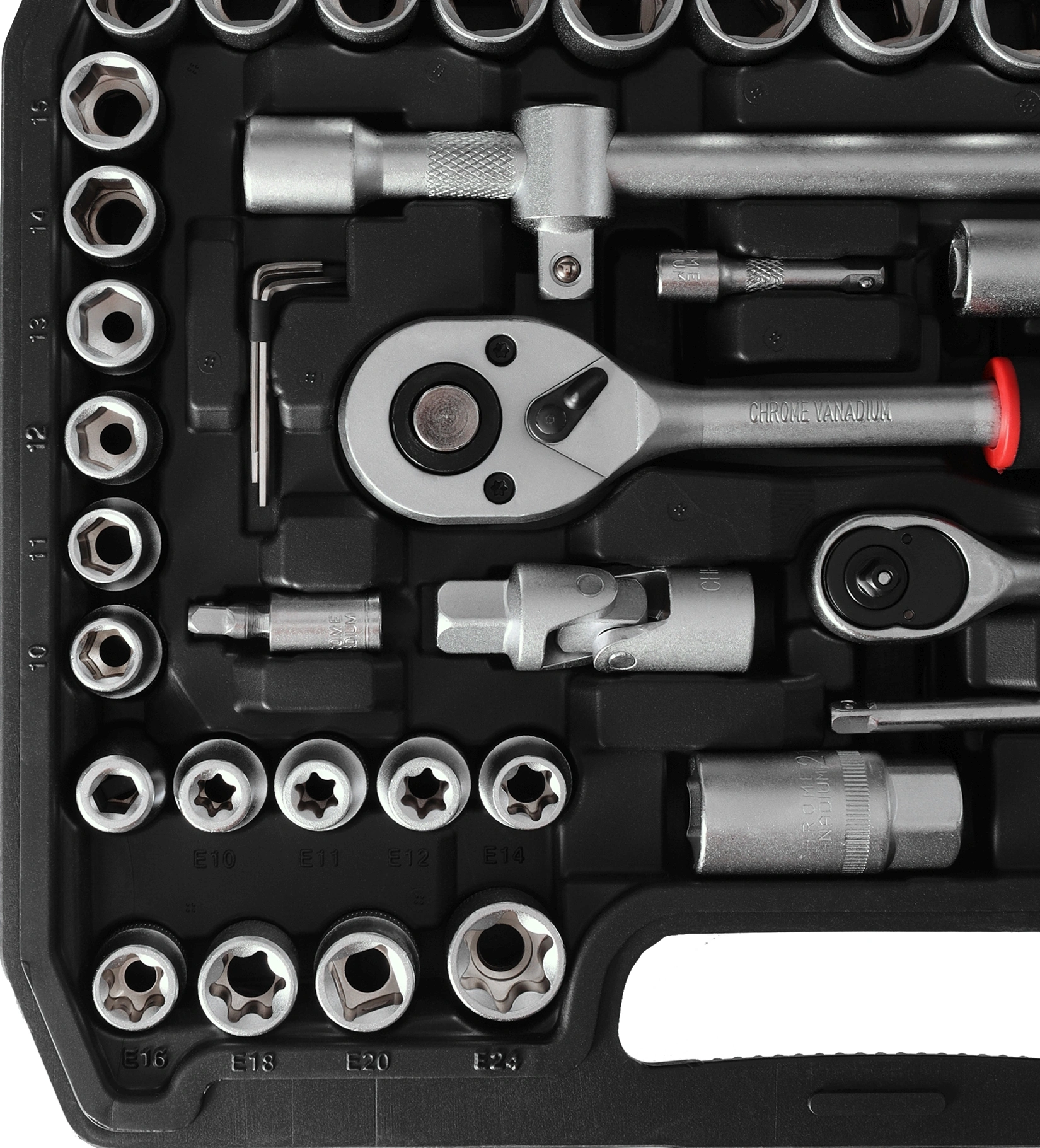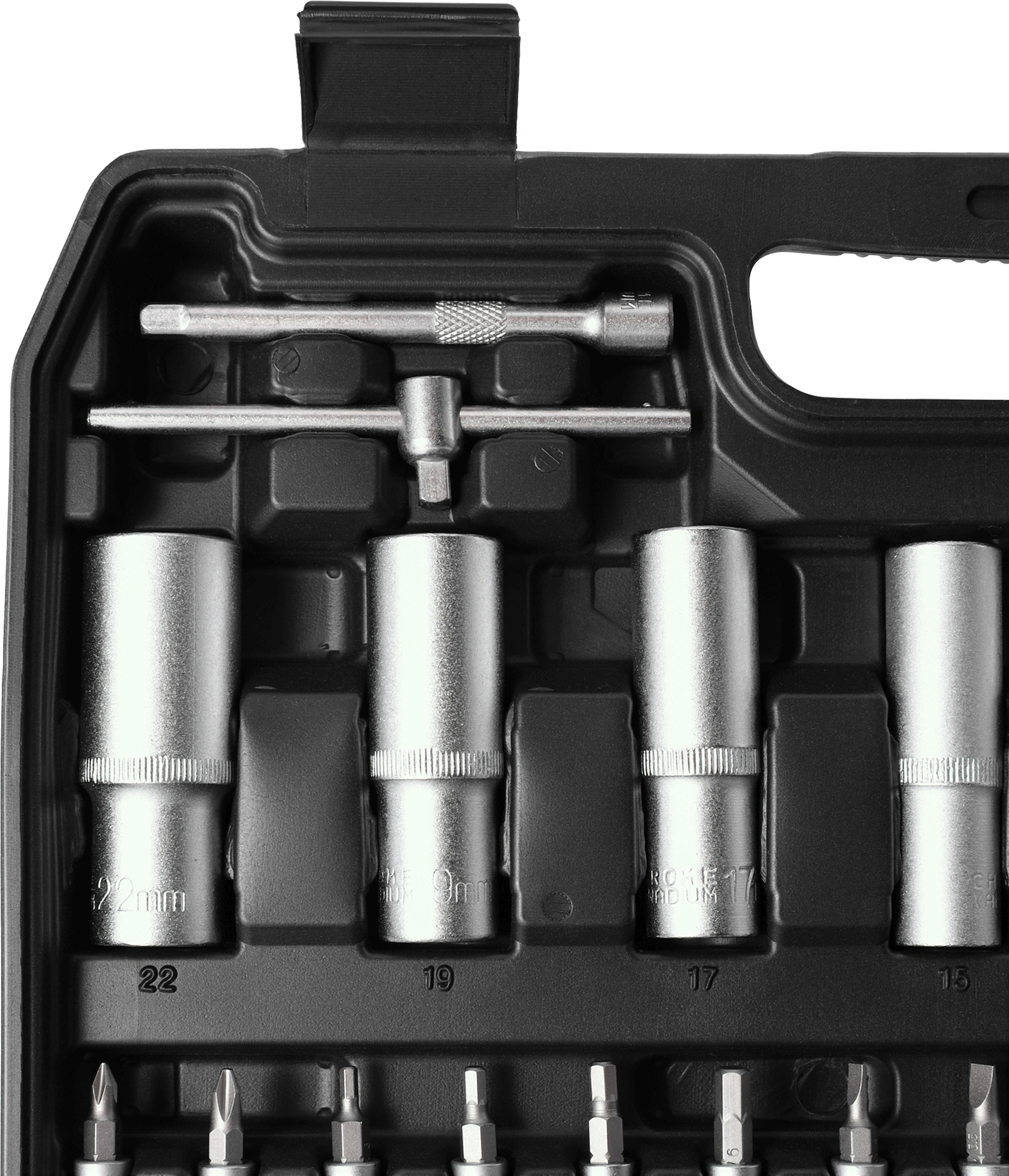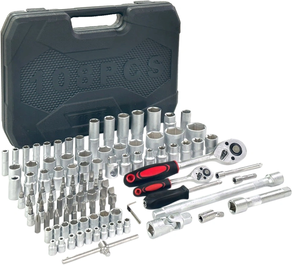 - Дополнительно в наборе, 1/2"DRудлинители: 5" и 10" универсальный соединитель рукоятка с реверсивной трещоткой 3-ходовой адаптердержатель бит