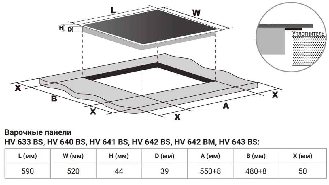- Размеры для встраивания550x480мм