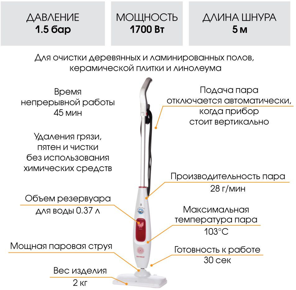 - ОсобенностиПаровая швабра использует пар для удаления грязи, пятен и чистки без использования химических средств. Подходит для очистки деревянных и ламинированных полов, керамической плитки и линолеума. Мощная паровая струя превосходно очищает и дезинфицирует. В комплекте многоразовые моющиеся насадки.