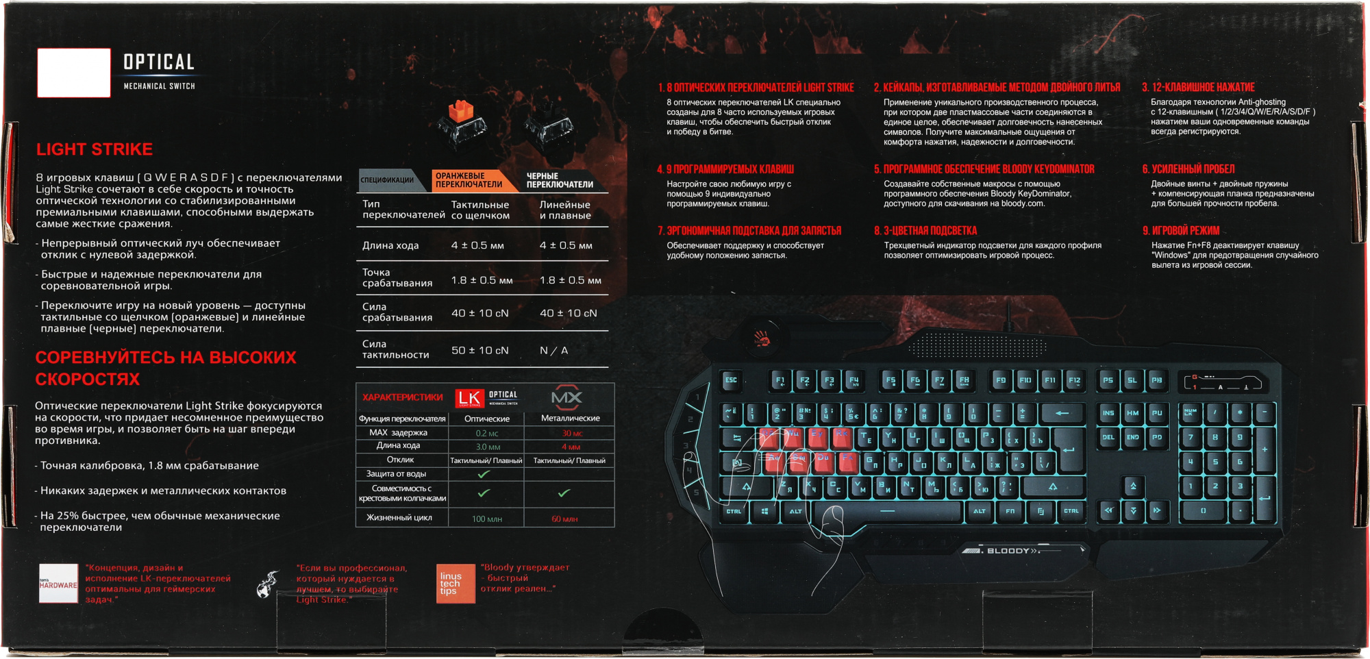 - Особенноститип клавиш – мембранные (частично механика), 8 игровых клавиш (эти клавиши без подсветки), время отклика – 0.2 мс., прорезиненные ножки. Технология: Light Strike. Оптические переключатели: QWER/ASDF.