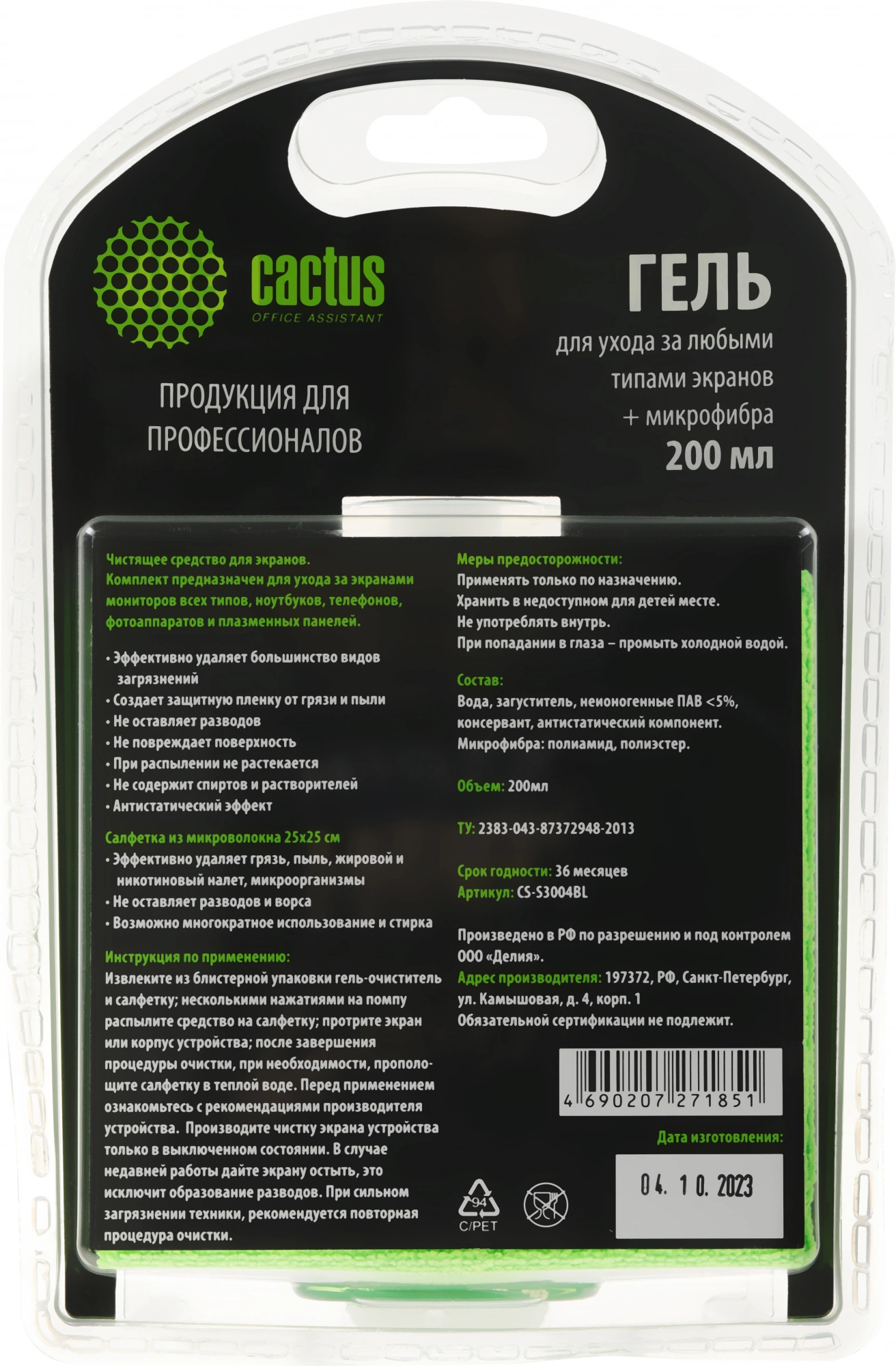 Чистящий набор (салфетки + гель) Cactus CS-S3004BL для экранов и оптики блистер 1шт 25х25см 200мл