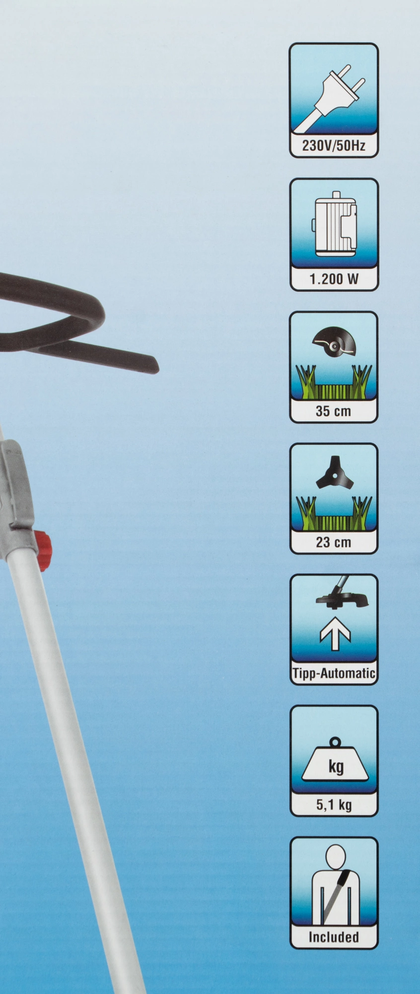 - ОсобенностиМощный двигатель – 1200 Вт; Возможность оснащения металлическим ножом или шпулькой с нейлоновой леской; Автоматическая регулировка лески; Ширина прохода 230 мм с ножом и 350 мм с леской; Работает от бытовой электросети 230 В; Дополнительная регулируемая D-образная ручка и плечевой ремень.