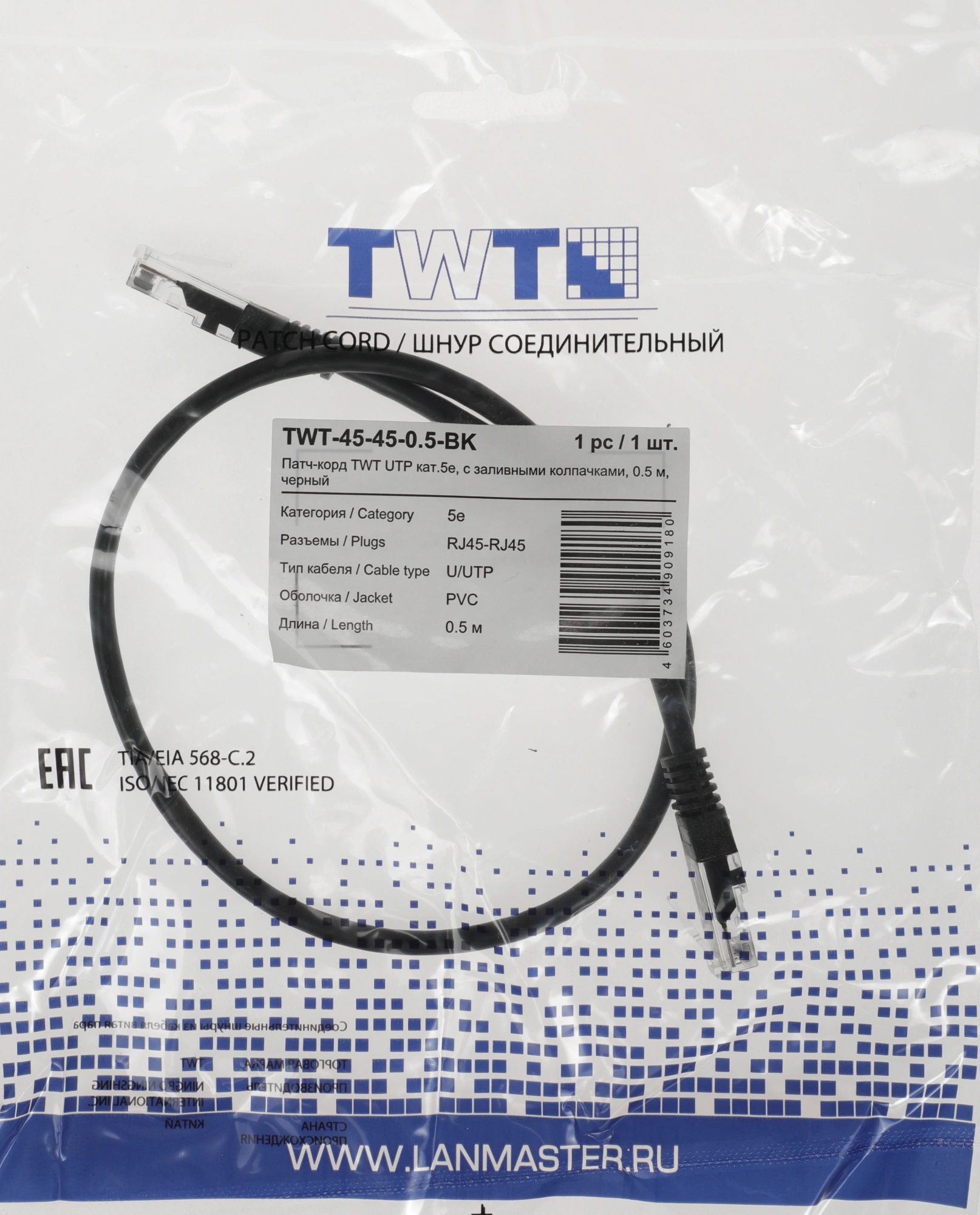 Патч-корд Lanmaster TWT-45-45-0.5-BK UTP RJ-45 вил.-вилка RJ-45 кат.5E 0.5м черный ПВХ (уп.:1шт)