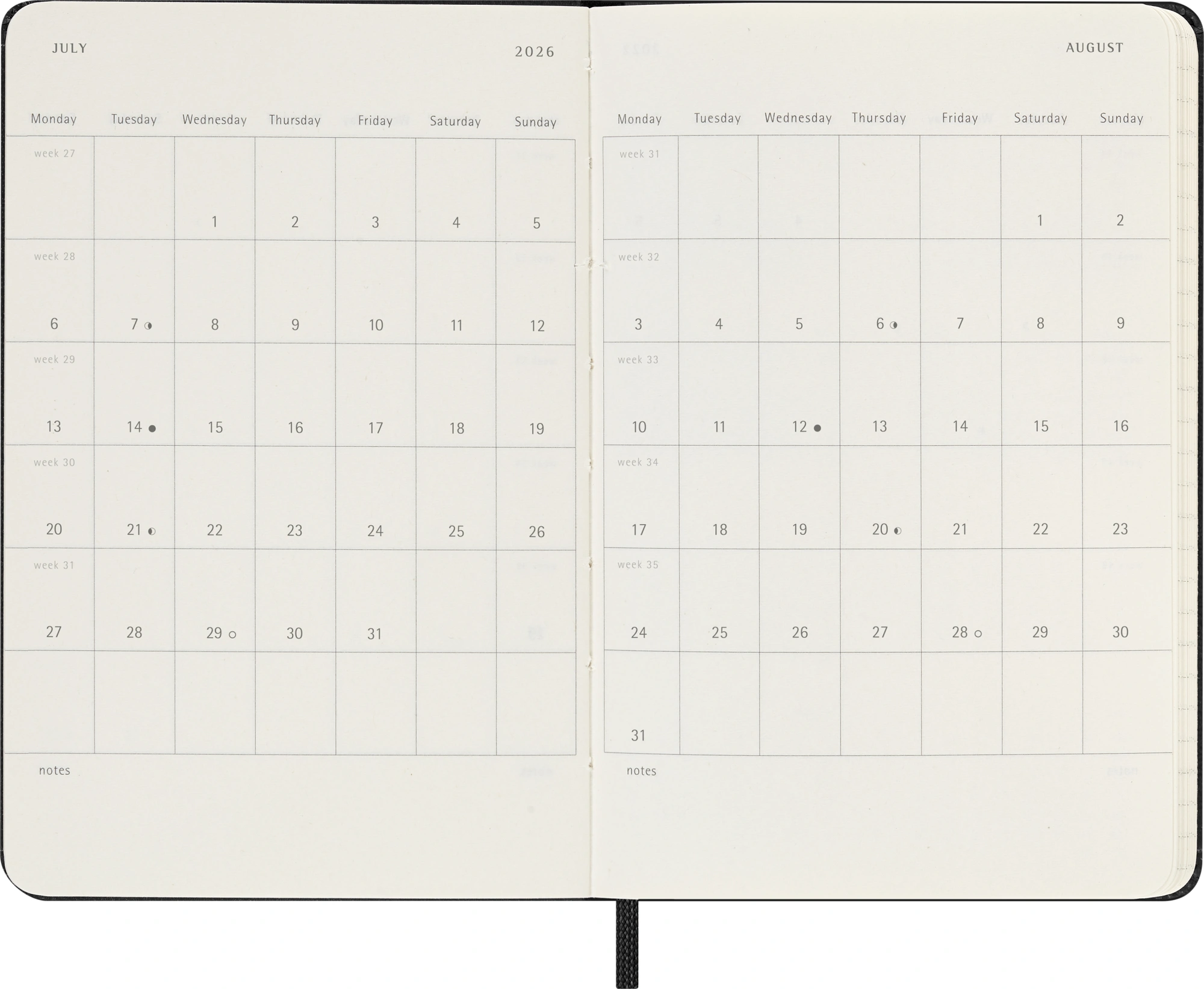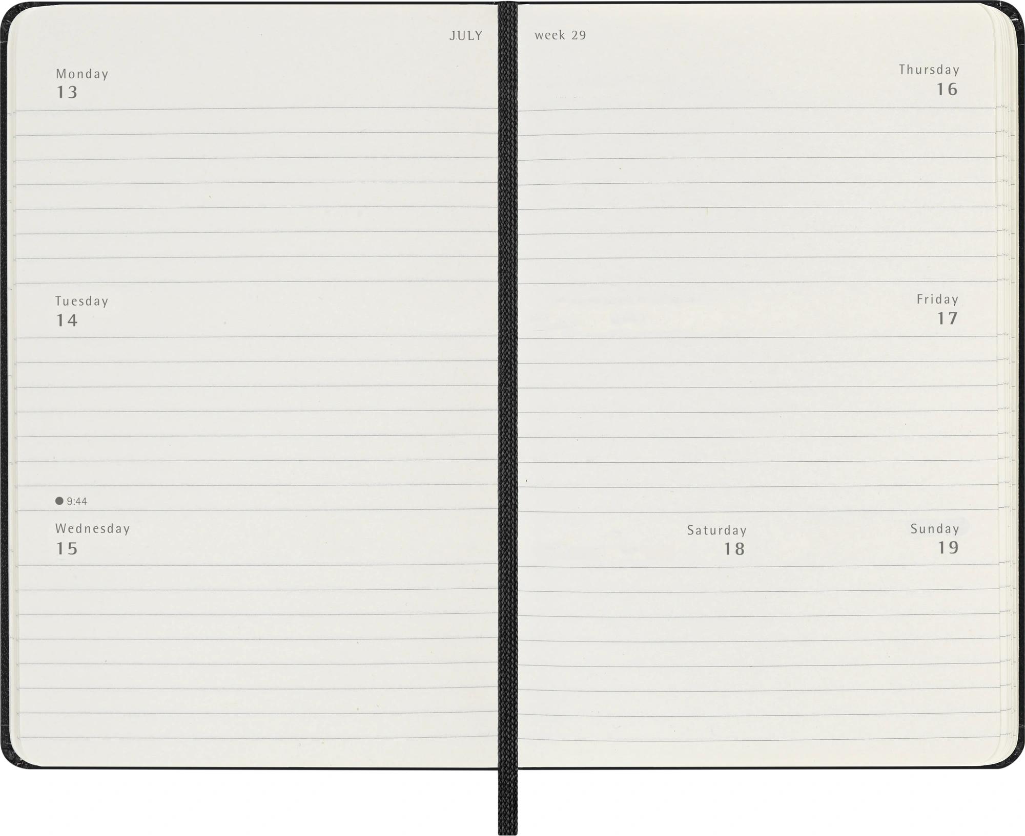 В еженедельнике Moleskine формата POCKET каждая неделя представлена на двухстраничном развороте (понедельник, вторник и среда слева, а четверг, пятница и суббота с воскресеньем справа). Такой формат идеально подойдет тем, кто хочет иметь возможность оценить неделю с одного взгляда