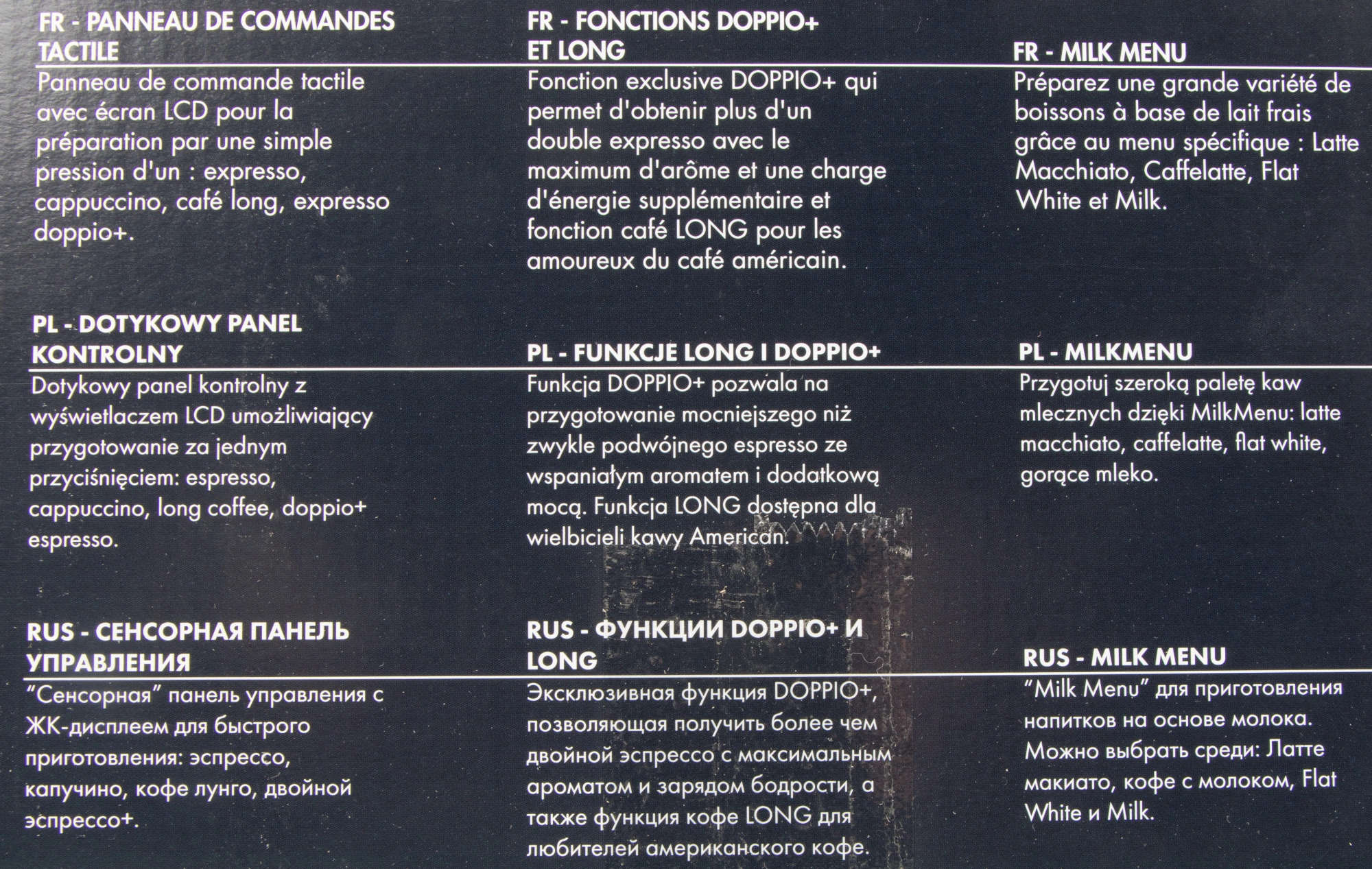 - Регулировкажесткости воды, крепости напитка, объема напитка, степени помола, температуры напитка