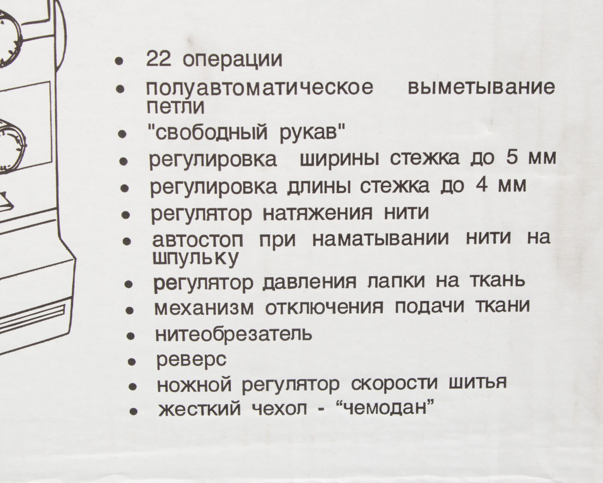 - Конструктивные особенностидополнительный подъем лапки, отсек для хранения принадлежностей, подсветка, рукавная платформа