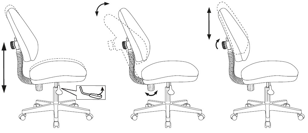 - Регулировкавысоты (газлифт), высоты спинки, глубины сиденья, жесткости качания