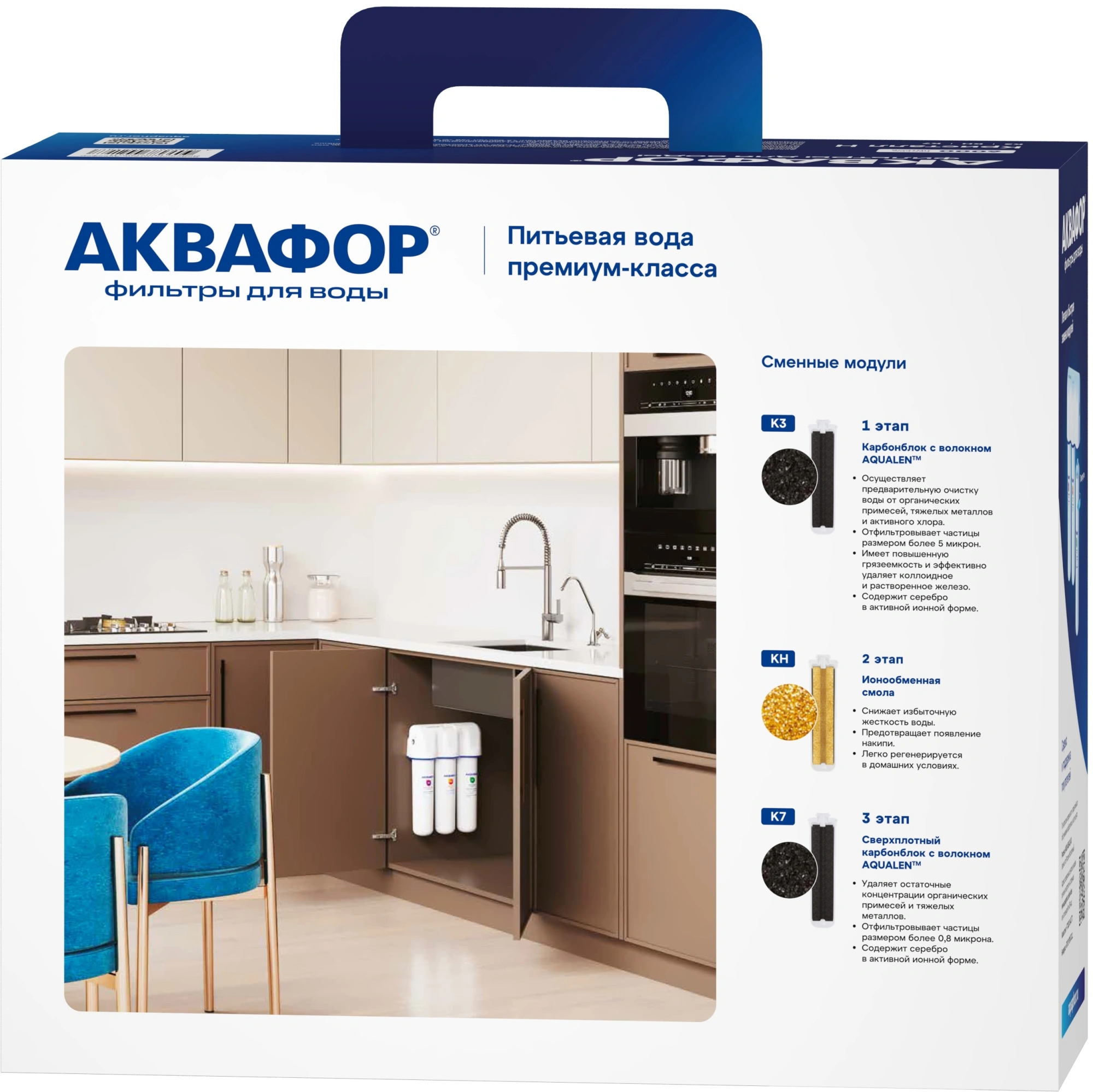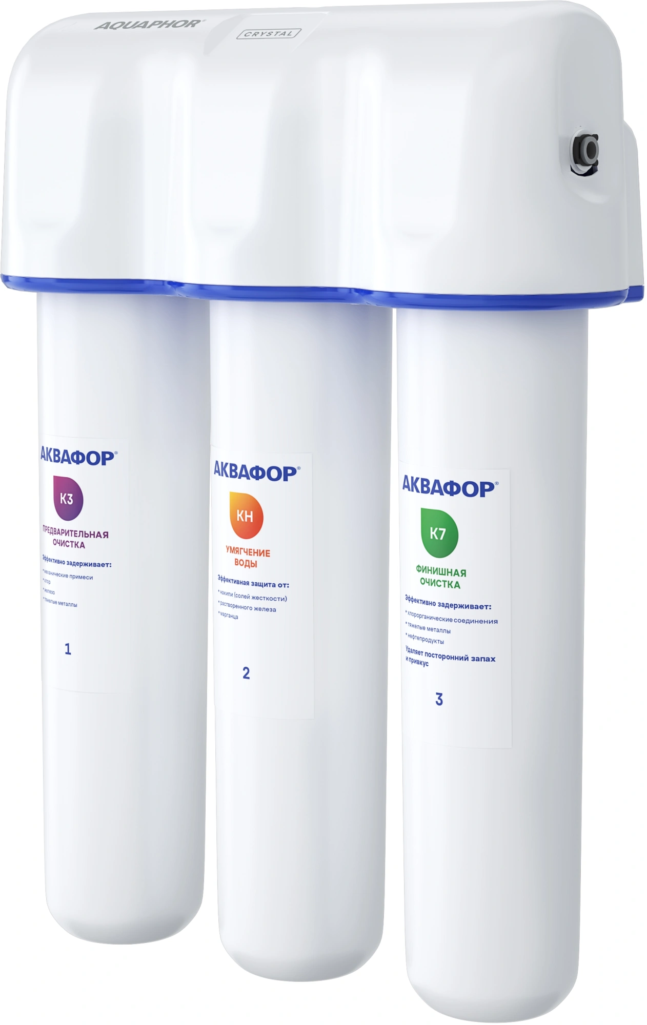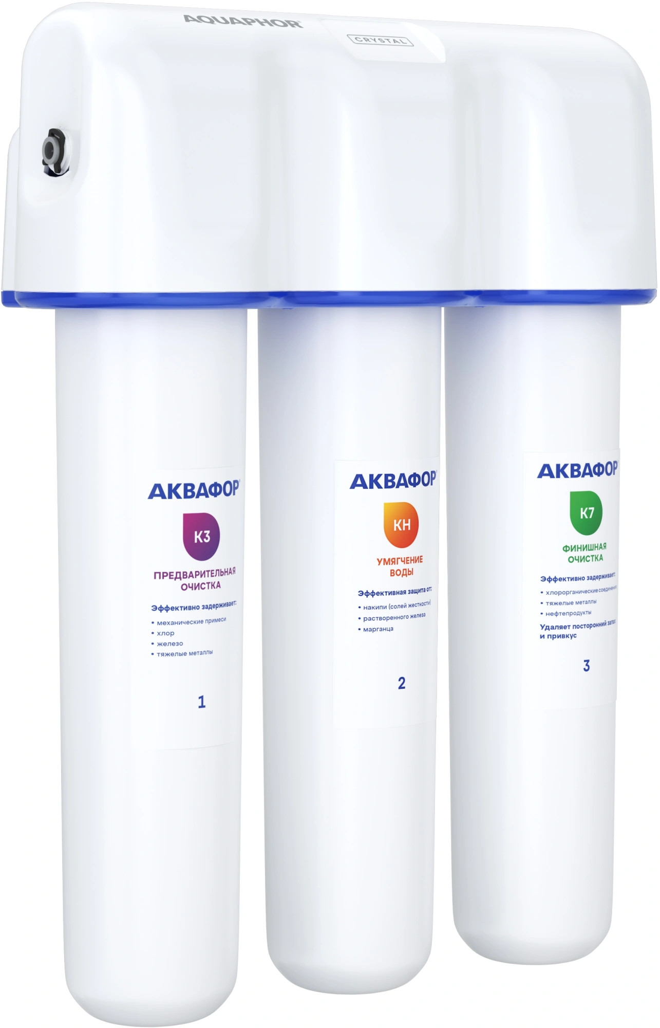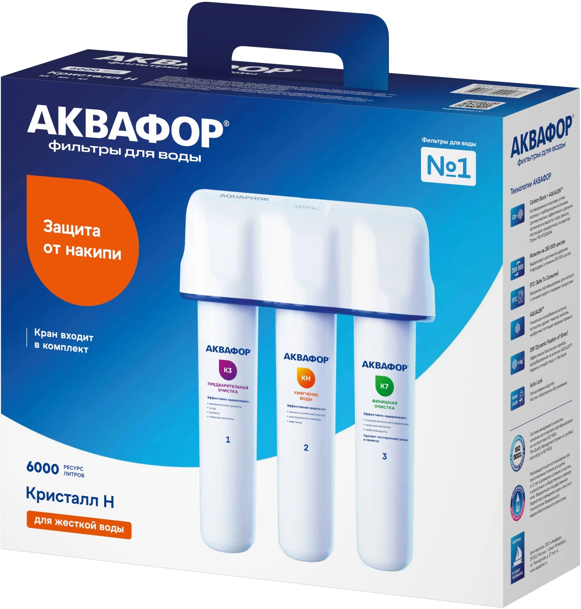 Аквафор Кристалл H — фильтр для глубокой очистки и умягчения питьевой воды. Компактный корпус фильтра легко помещается под мойкой, а на поверхности крепится отдельный кран для чистой воды. В комплекте модули К3, КН, К7
