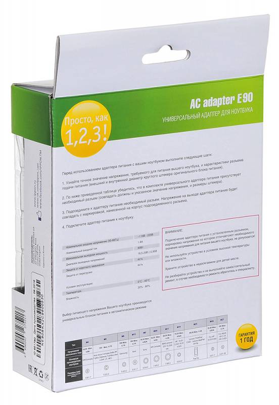 Устройство представляет собой универсальный импульсный адаптер питания для ноутбуков с максимальной выходной мощностью 120Вт. Выходное напряжение постоянного тока на выходе адаптера питания может принимать одно из следующих значений: 18,5В, 19В, 19,5В, 20В.