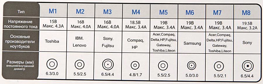 - Штекер 6диаметр: 5.0/3.2 мм, 19v, 3.4A