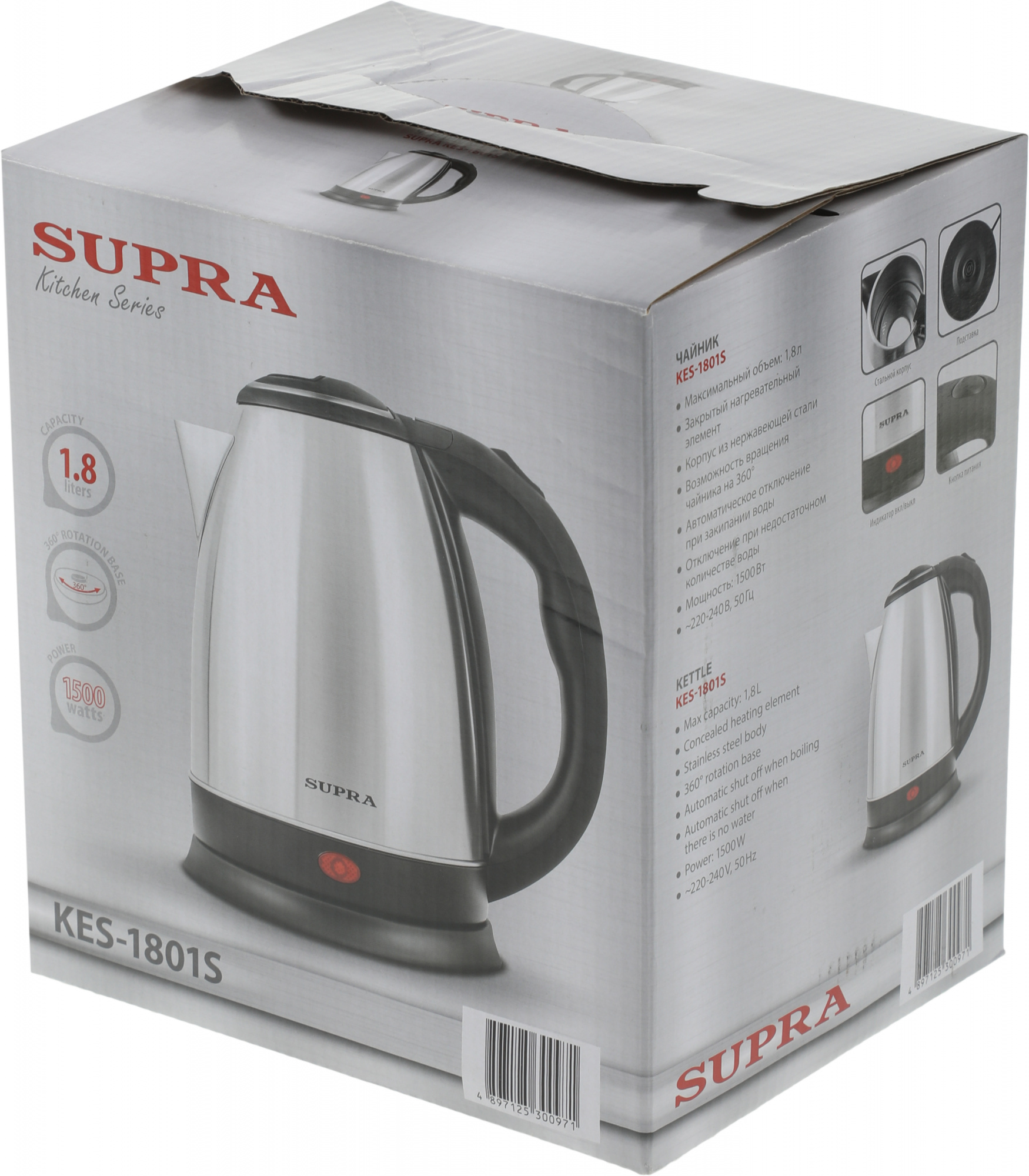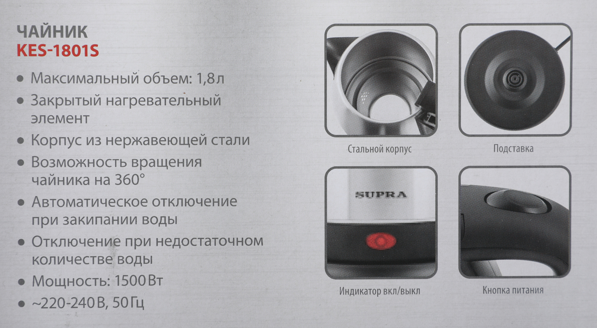 Чайник электрический Supra KES-1801S 1.8л. 1500Вт серебристый/черный корпус: металл/пластик