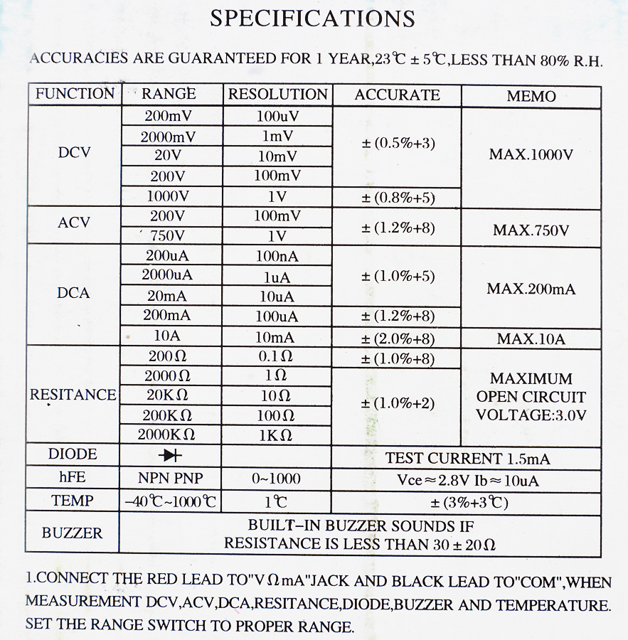 3,5 разрядный ж/к дисплей, чувствительность - 100 мкВ, 20-позиционный переключатель режимов работы и пределов. Постоянное напряжение DCV 200м-2-20-200-1000 В, переменное напряжение ACV 200-750 В, постоянный ток DCA 200-2000мк-20м-200мк-10А, сопротивление OHM 200-2000-20к-200к-2000кОм.