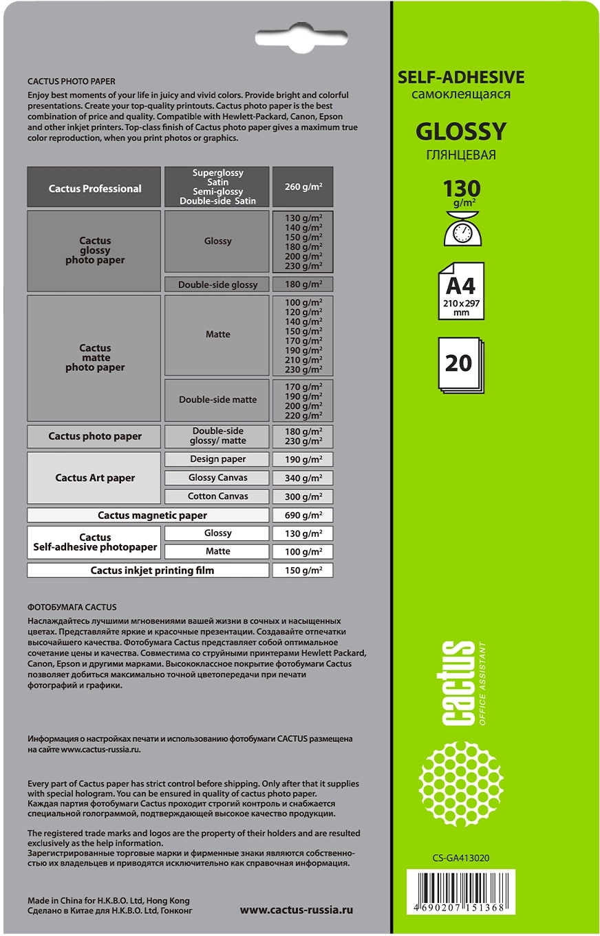 Фотобумага Cactus CS-GSA413020 A4/130г/м2/20л. глянцевое самоклей. для струйной печати