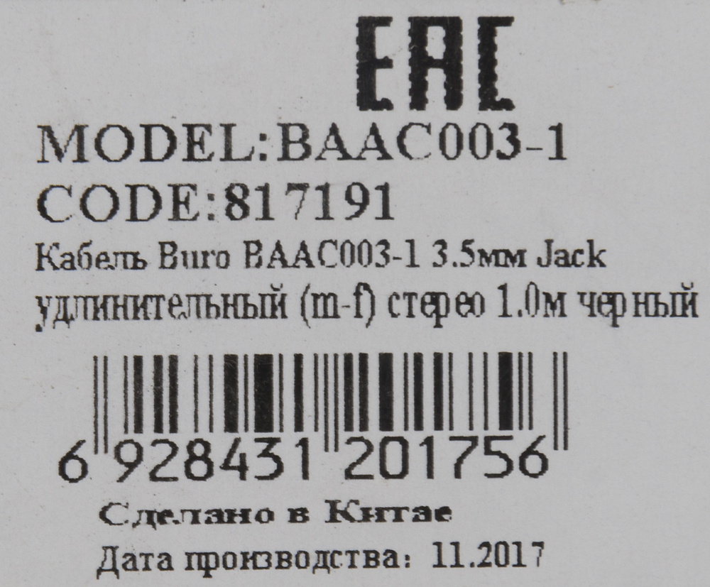 Кабель-удлинитель аудио Buro BAAC003-1 Jack 3.5 (m)/Jack 3.5 (f) 1м. черный