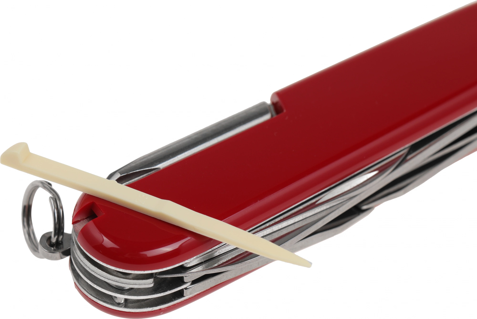 - Список функцийНож, малый нож, пила, олкрывалка, консервный нож, 3 отвертки, сниматель изоляции, шило, кольцо для ключей, пинцет, зубочистка.