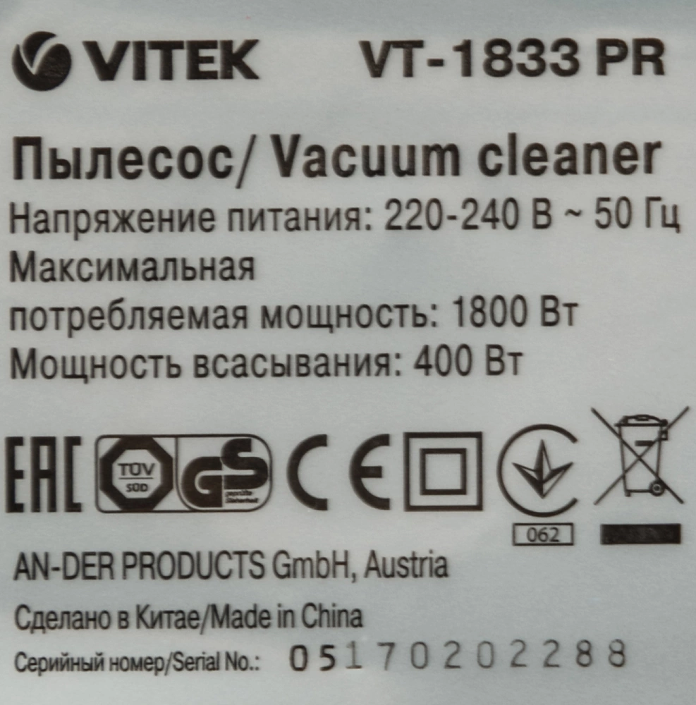 Пылесос Vitek VT-1833 PR 1800Вт жемчужный/синий