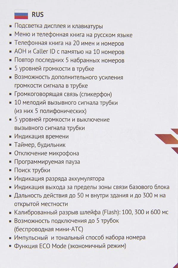 - Особенностипоиск трубки, программируемая пауза, отключение микрофона, экономичный режим, индикация выхода за пределы зоны связи базового блока, индикация разряда аккумулятора