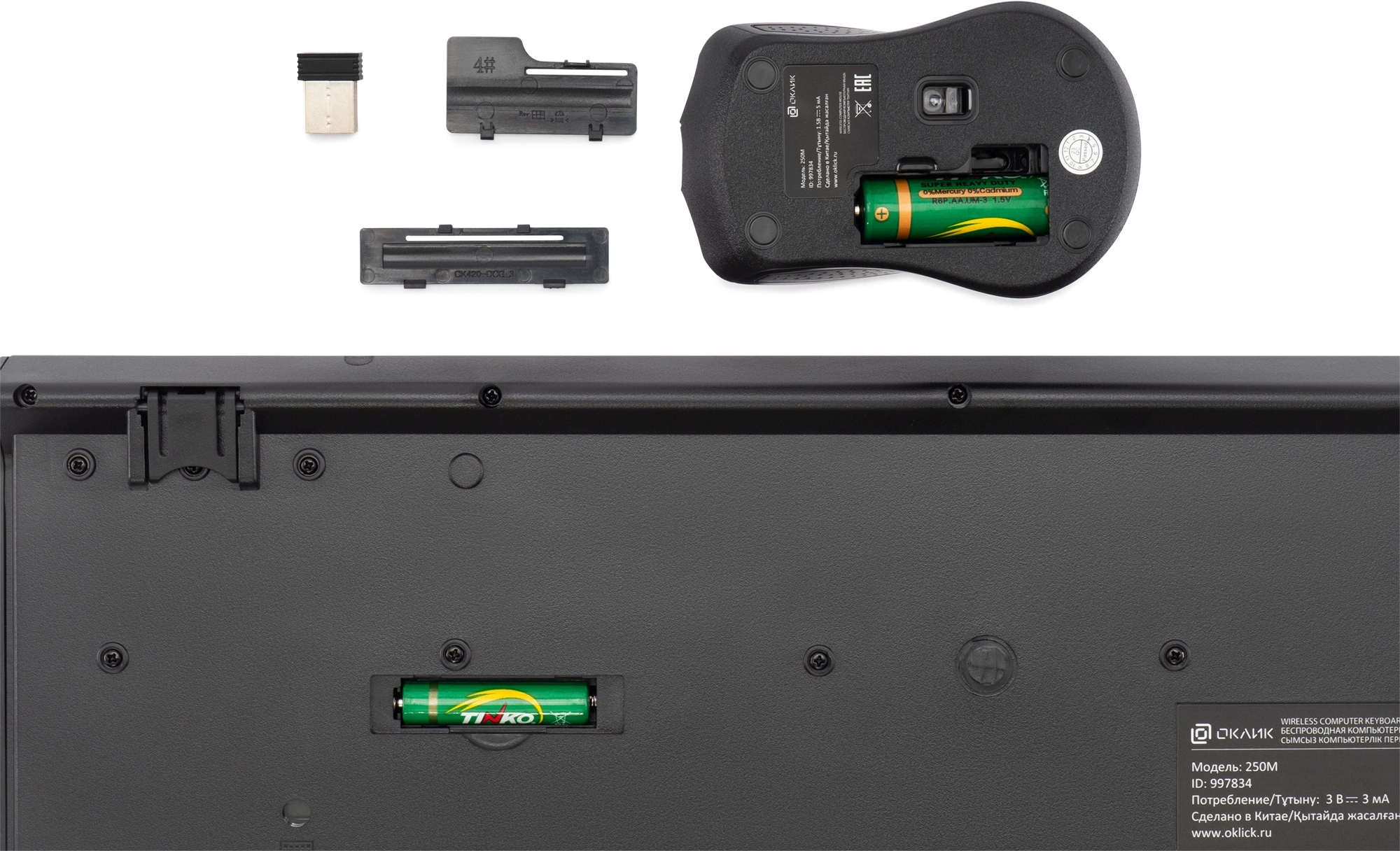 - Комплект поставкиБеспроводная клавиатура и мышь 250M, батарейка «AAA» - 3, USB-ресивер